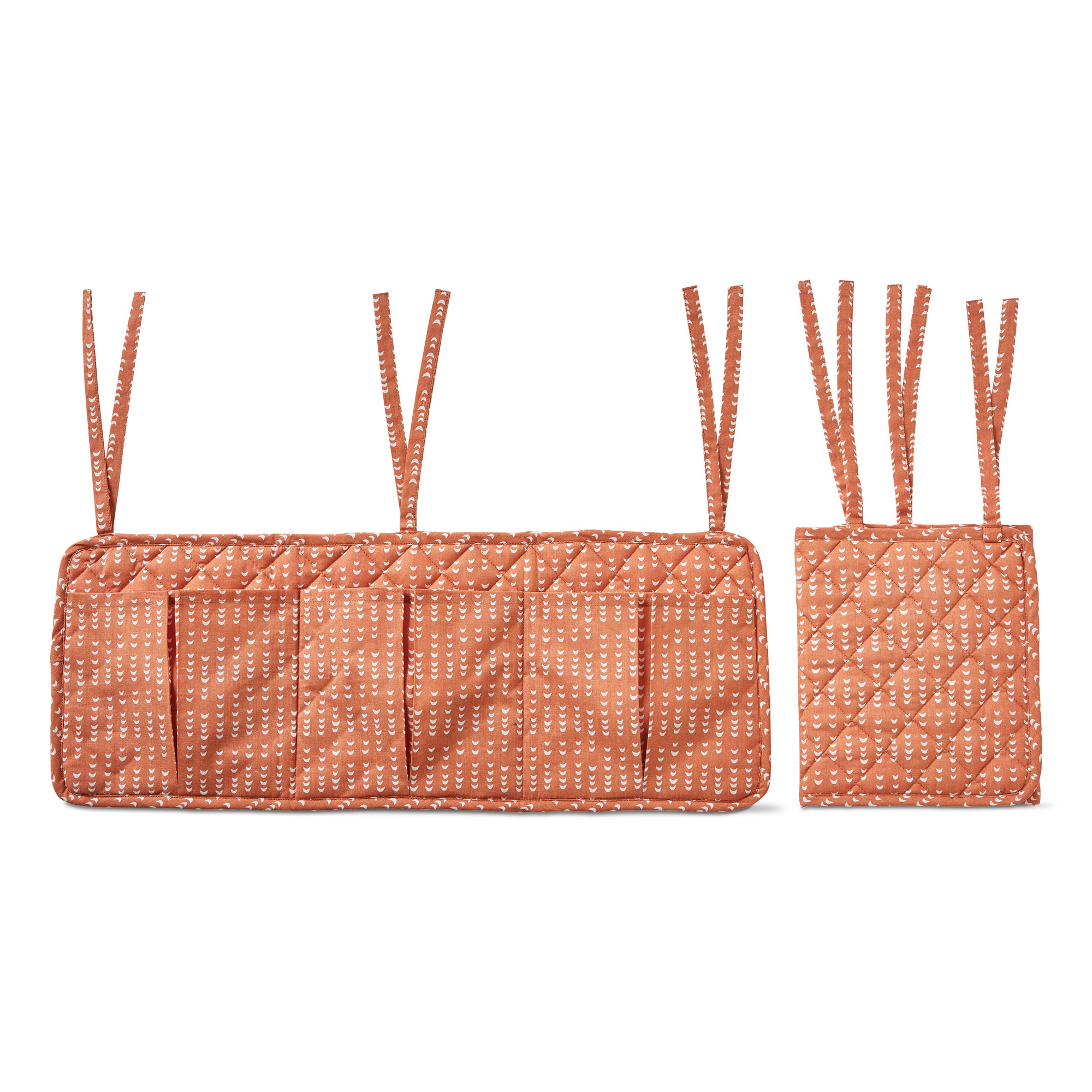 Designed for busy parents, this pocket organizer is perfect for moms and dads on the go. take on day trips or keep an extra in the car just in case. made of prewashed organic cotton, this organizer features self-fabric ties that can be tied onto a changing table, crib or cabinet. each pocket has a center pleat for extra room to keep toys, wipes, creams and other essentials close at hand. coated with a clear acrylic for easy clean up. hand printed with exclusive tag design.
