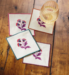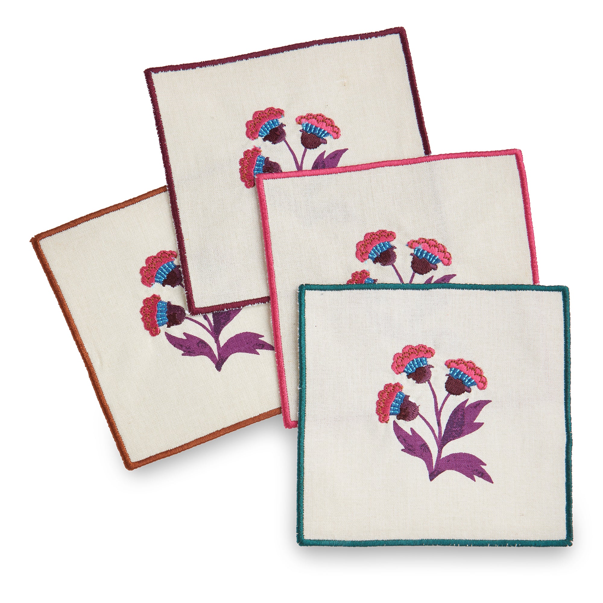 Autumn Bloom cotton coasters showcase printed florals and embroidery that protect tabletops while echoing the story on runners and napkins. Hand painted details add warmth while its versatile design makes styling simple. Sized for layered displays and pairs beautifully with seasonal greenery and décor. View all items in Grace & Gratitude.
