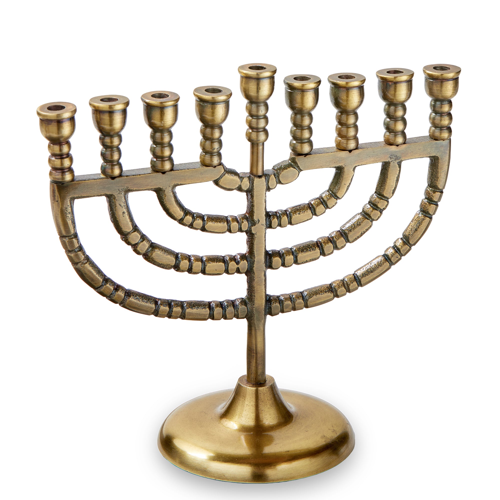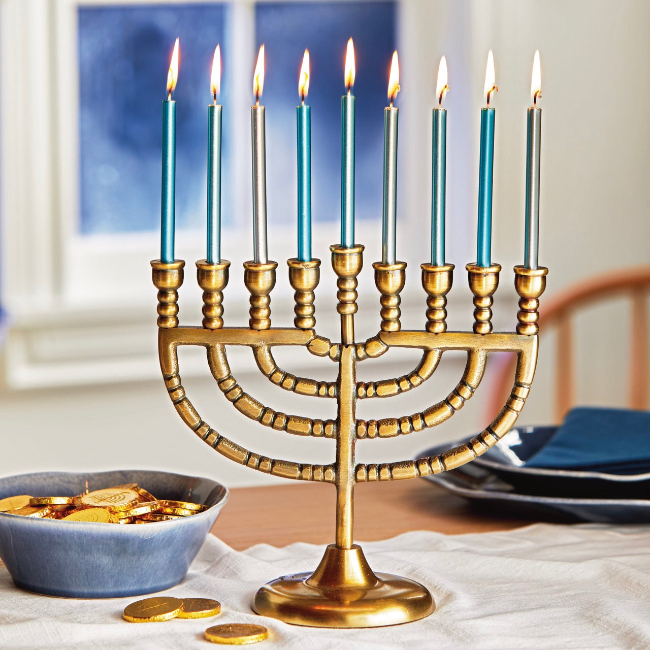 Antique brass menorah with graceful arms crafted from iron for a timeless holiday centerpiece. Holds standard menorah candles and adds warm metallic shine to mantels or dining tables. A beautiful heirloom style piece. Hand painted details add warmth while its versatile design makes styling simple. Sized for layered displays and pairs beautifully with seasonal greenery and décor. View all items in Hanukkah.