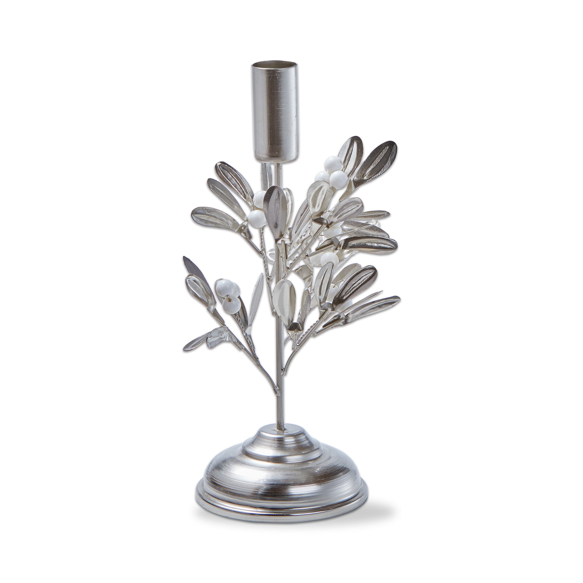 Shorter nickel iron taper holder featuring sculpted sprigs for a subtle winter accent. Fits standard taper candles and layers beautifully with taller holders for a complete holiday candle display. Hand painted details add warmth while its versatile design makes styling simple. Sized for layered displays and pairs beautifully with seasonal greenery and décor. View all items in Winter Berries.