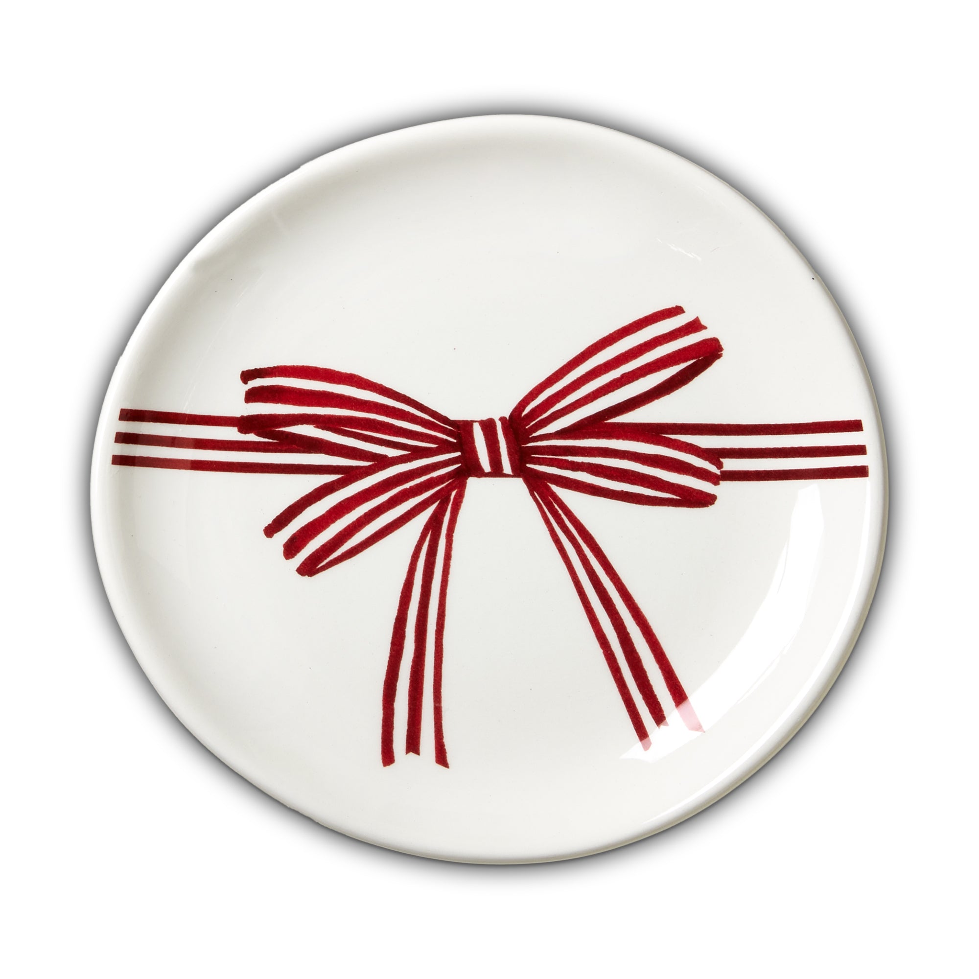 Bow appetizer plate that adds a sweet festive touch to holiday snacks and small bites. Hand painted details add warmth while its versatile design makes styling simple. Sized for layered displays and pairs beautifully with seasonal greenery and décor. View all items in Winter Berries.