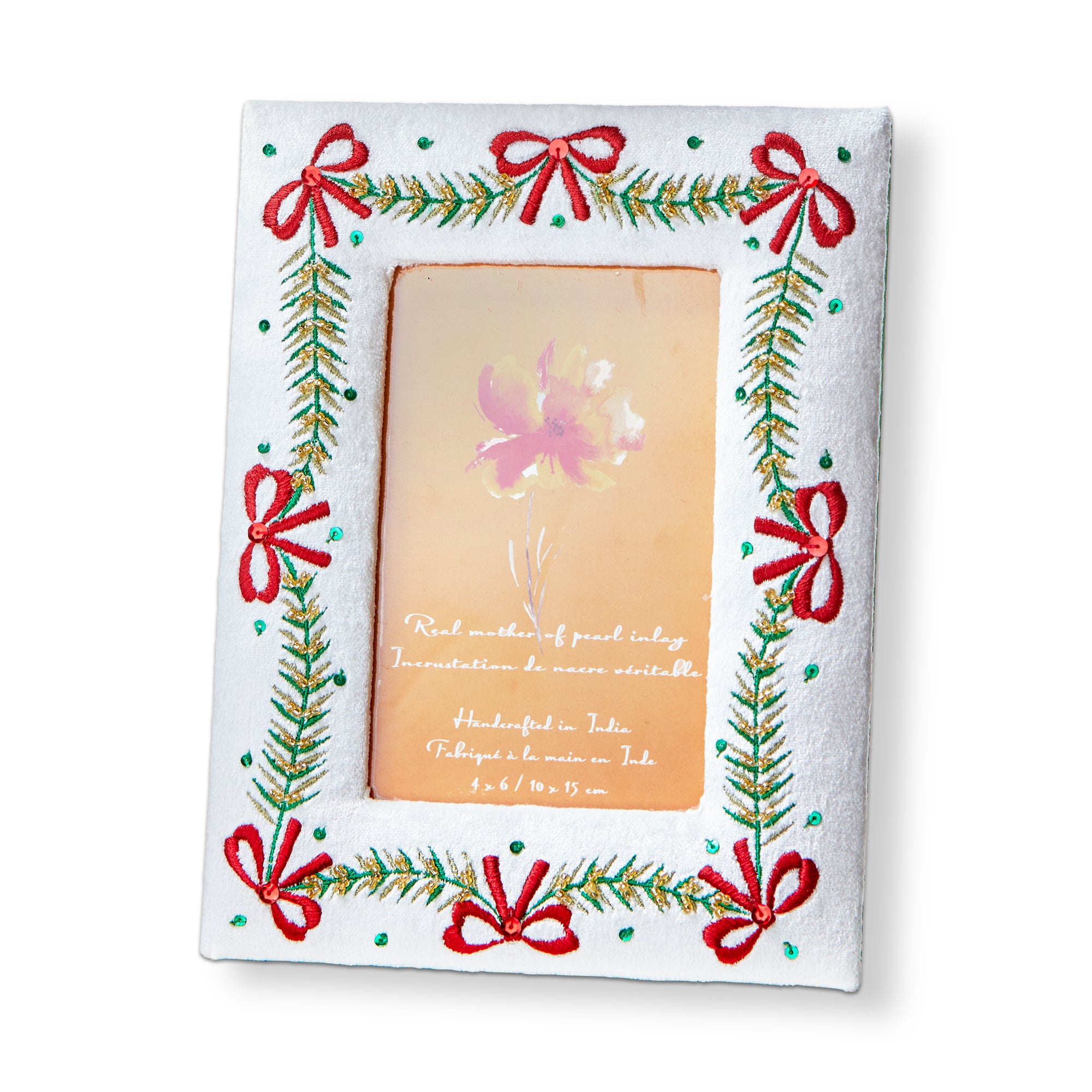 Velvet embroidered frame with beads and sequins that bring soft sparkle to holiday displays. The glass front protects a 4 by 6 photo while the bow garland detail adds festive elegance. Beautiful for gifting. Hand painted details add warmth while its versatile design makes styling simple. Sized for layered displays and pairs beautifully with seasonal greenery and décor. View all items in Winter Berries.