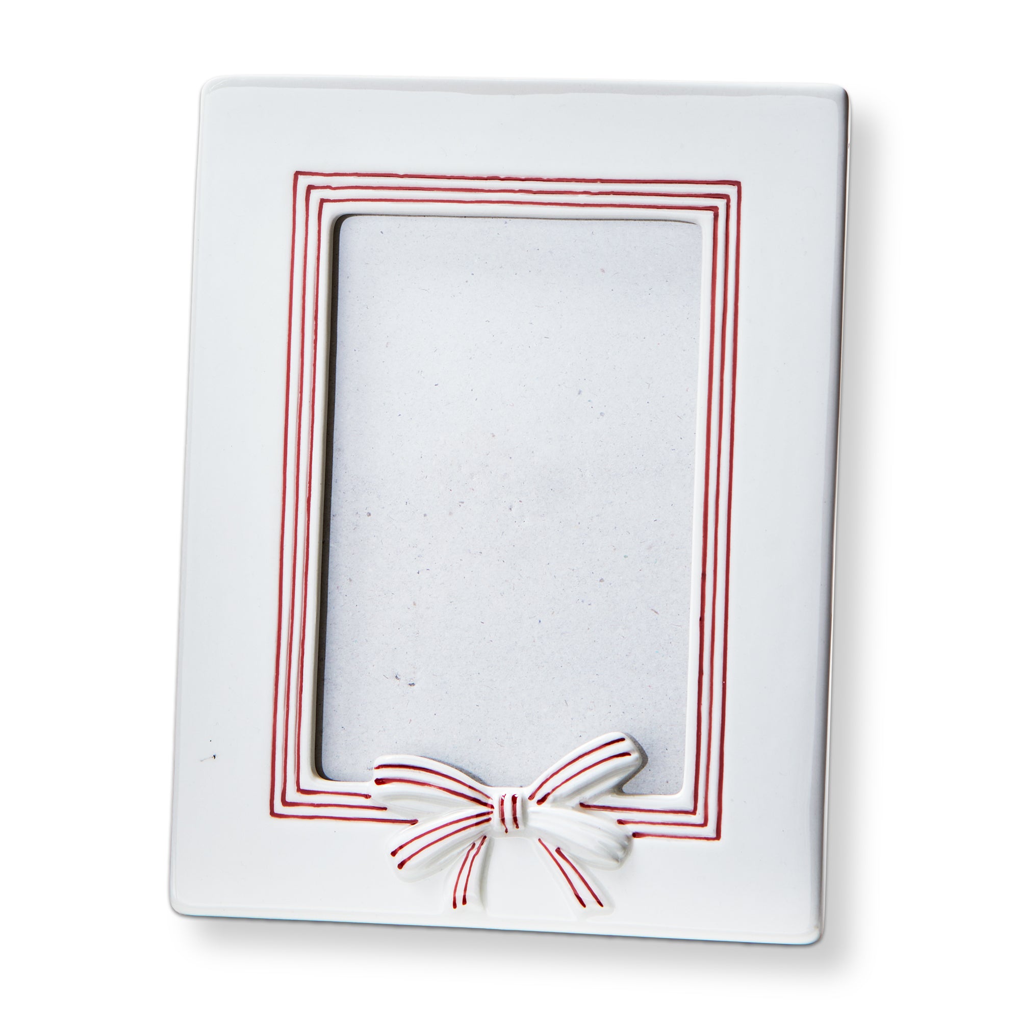 Festive red earthenware frame with an embossed bow that adds cheerful charm to mantels and shelves. The glass front protects a favorite 4 by 6 photo while the sculpted details bring texture to holiday displays. Perfect for gifting or pairing with seasonal décor. Hand painted details add warmth while its versatile design makes styling simple. Sized for layered displays and pairs beautifully with seasonal greenery and décor. View all items in Winter Berries.