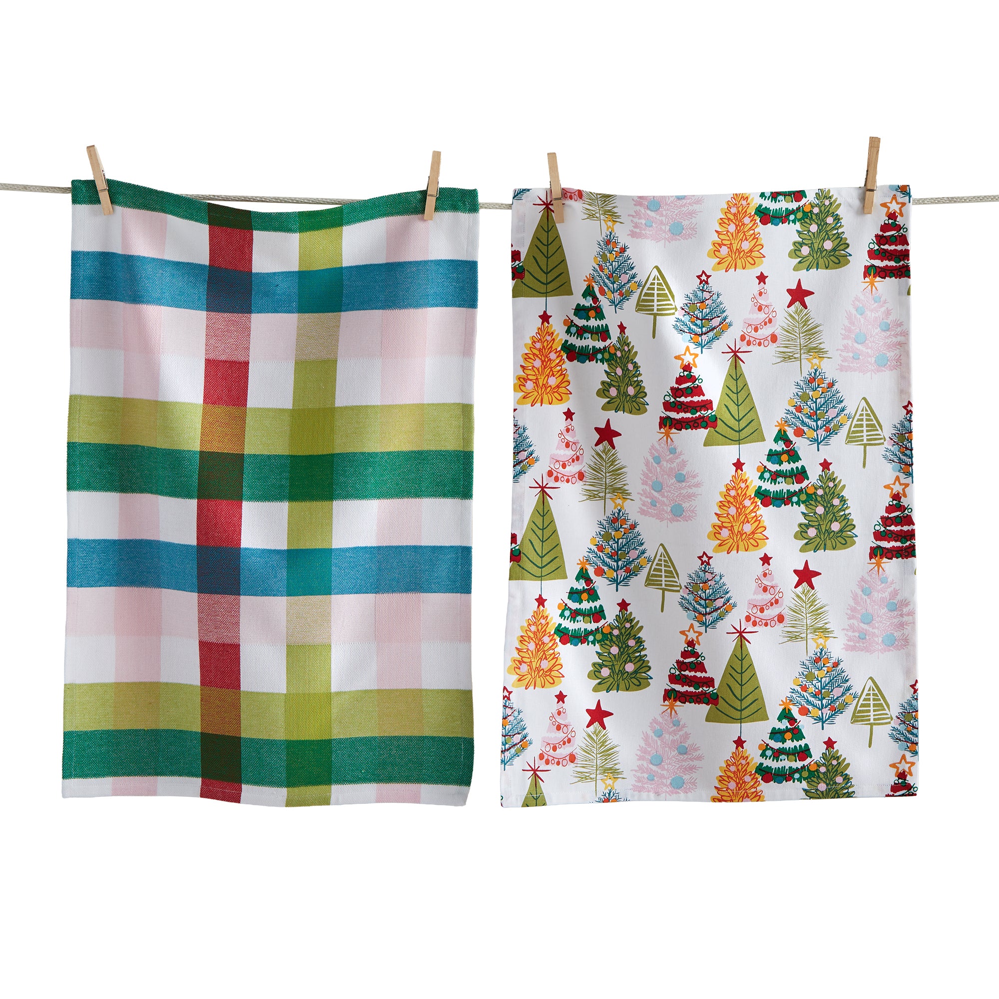 Groovy Christmas trees dishtowel set mixes a playful tree print with coordinating plaid for a fun retro look on oven doors and hooks. Hand painted details add warmth while its versatile design makes styling simple. Sized for layered displays and pairs beautifully with seasonal greenery and décor. View all items in Groovy Christmas.
