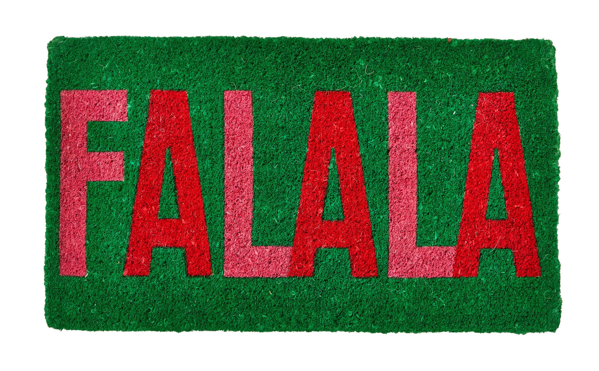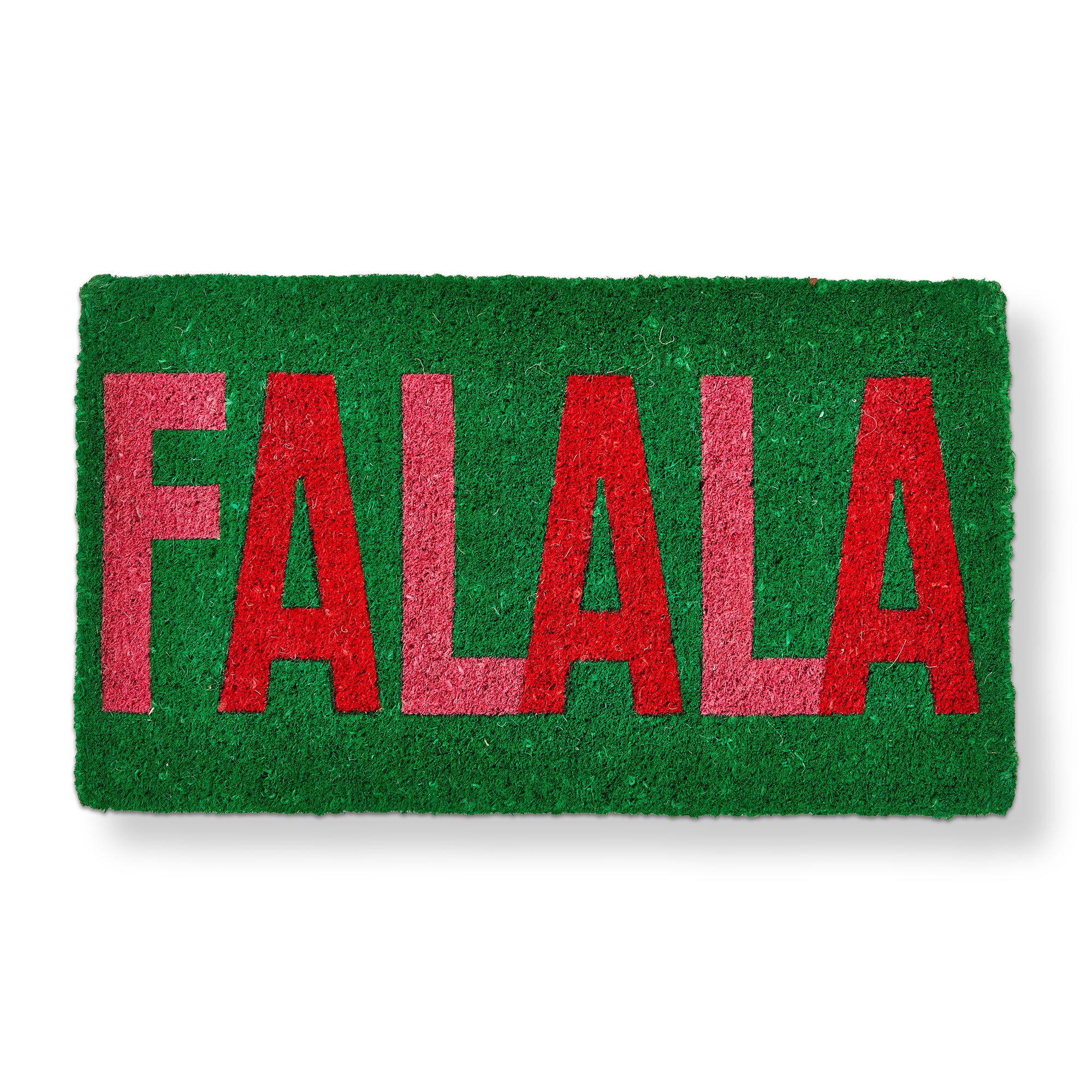 Festive coir mat featuring bold falala lettering in bright holiday colors. Hand spun coir fibers offer durability while the hand painted design adds cheerful personality to front doors. Perfect under covered porches. Hand painted details add warmth while its versatile design makes styling simple. Sized for layered displays and pairs beautifully with seasonal greenery and décor. View all items in Groovy Christmas.