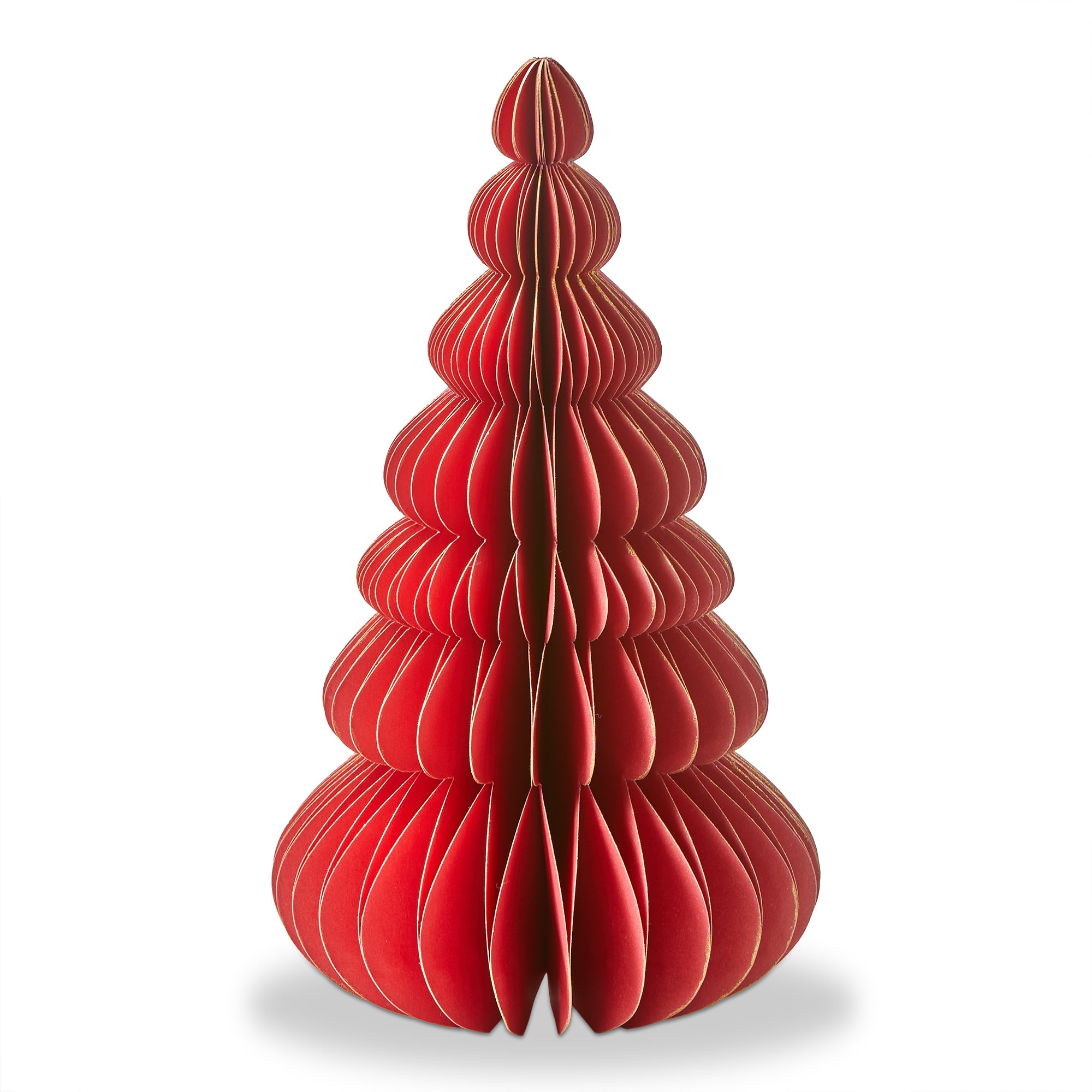 Small groovy paper tree in bright red that opens into a pleated cone. Fun color and sculptural shape make it an easy accent for shelves or mantels. Hand painted details add warmth while its versatile design makes styling simple. Sized for layered displays and pairs beautifully with seasonal greenery and décor. View all items in Groovy Christmas.