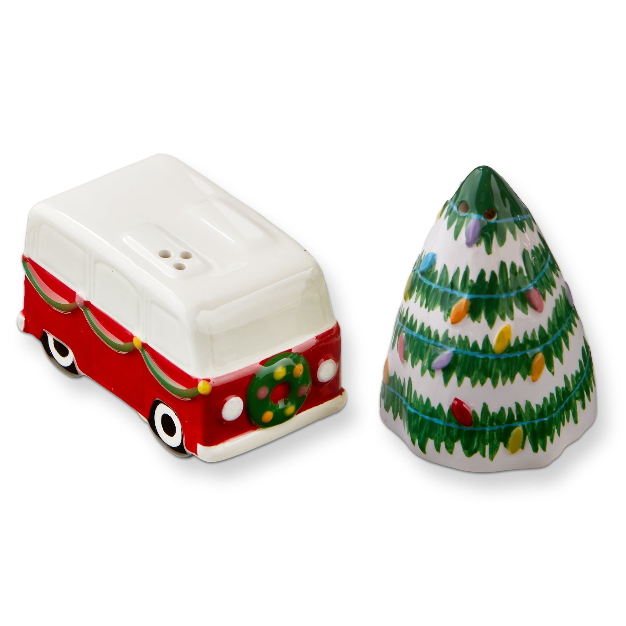 Sculpted Groovy S&P set featuring a retro holiday van and matching tree, complete with hand painted details and gift ready packaging. A charming accent for festive kitchens and table settings. Hand painted details add warmth while its versatile design makes styling simple. Sized for layered displays and pairs beautifully with seasonal greenery and décor. View all items in Groovy Christmas.