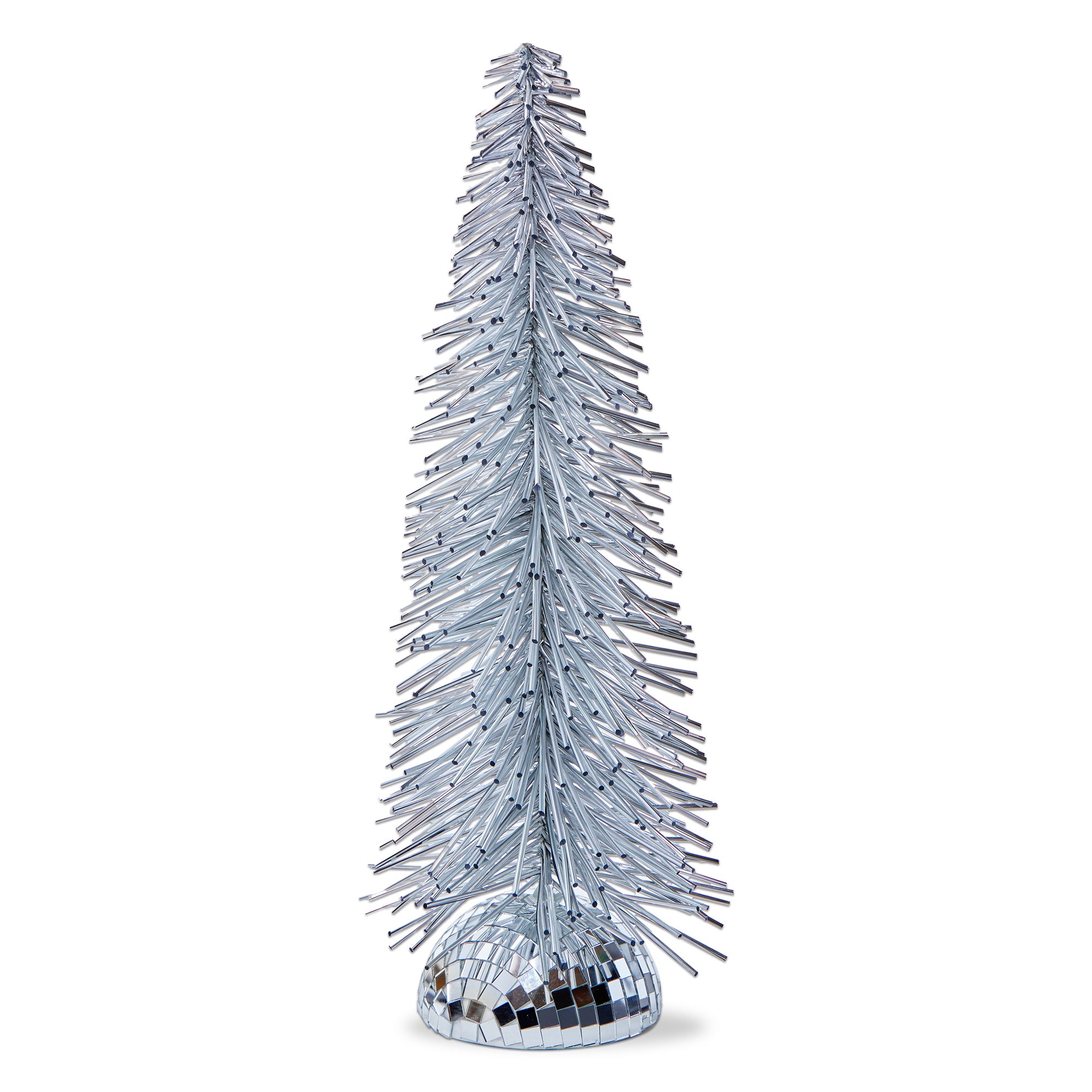 Tall silver groovy tree with a disco inspired base for a fun retro holiday accent. Adds shine and personality to tabletops or shelves. Hand painted details add warmth while its versatile design makes styling simple. Sized for layered displays and pairs beautifully with seasonal greenery and décor. View all items in Groovy Christmas.