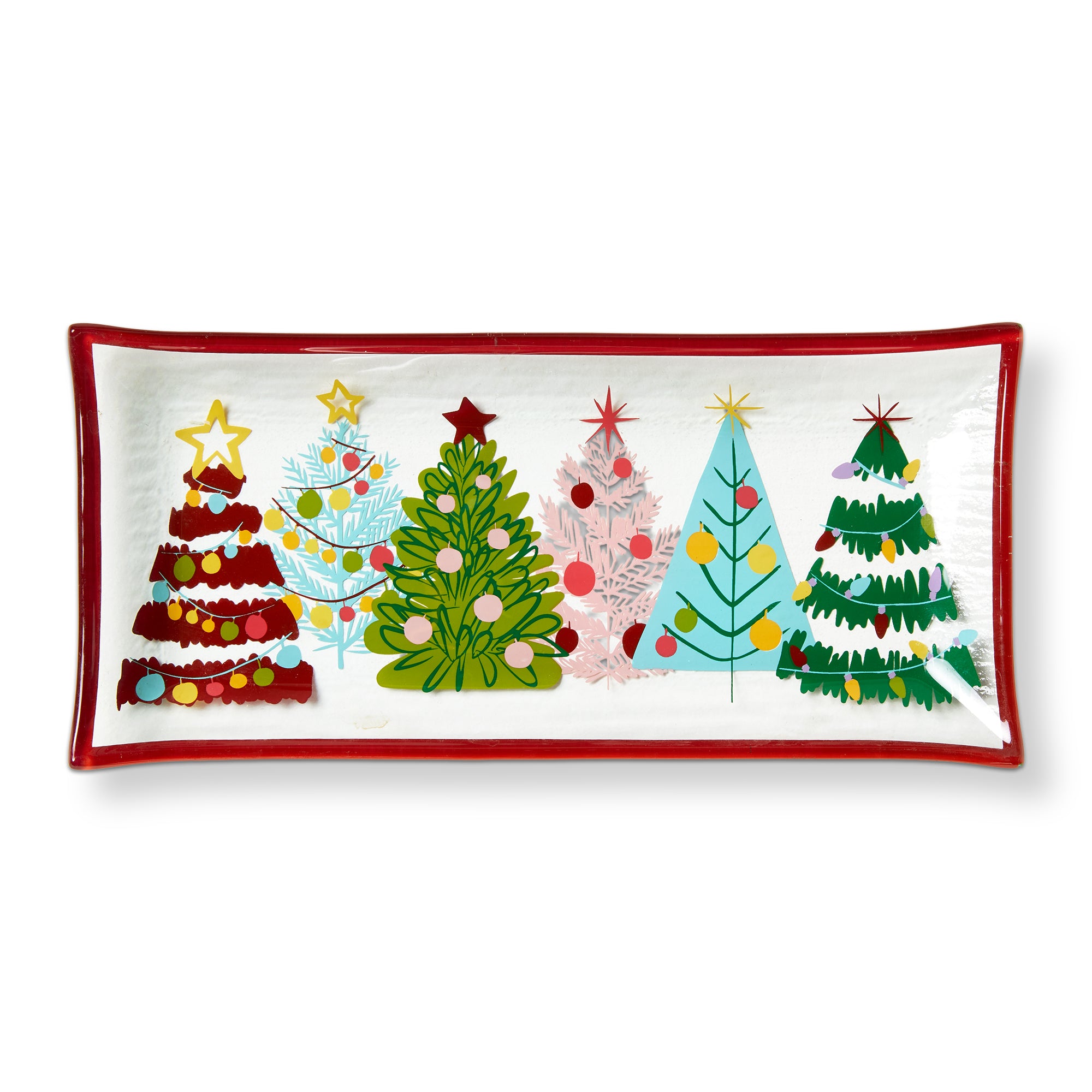 Groovy glass trinket tray decorated with colorful retro trees for a fun holiday vibe. Ideal for keys, jewelry or small festive treats and a great addition to cheerful seasonal vignettes. Hand painted details add warmth while its versatile design makes styling simple. Sized for layered displays and pairs beautifully with seasonal greenery and décor. View all items in Groovy Christmas.