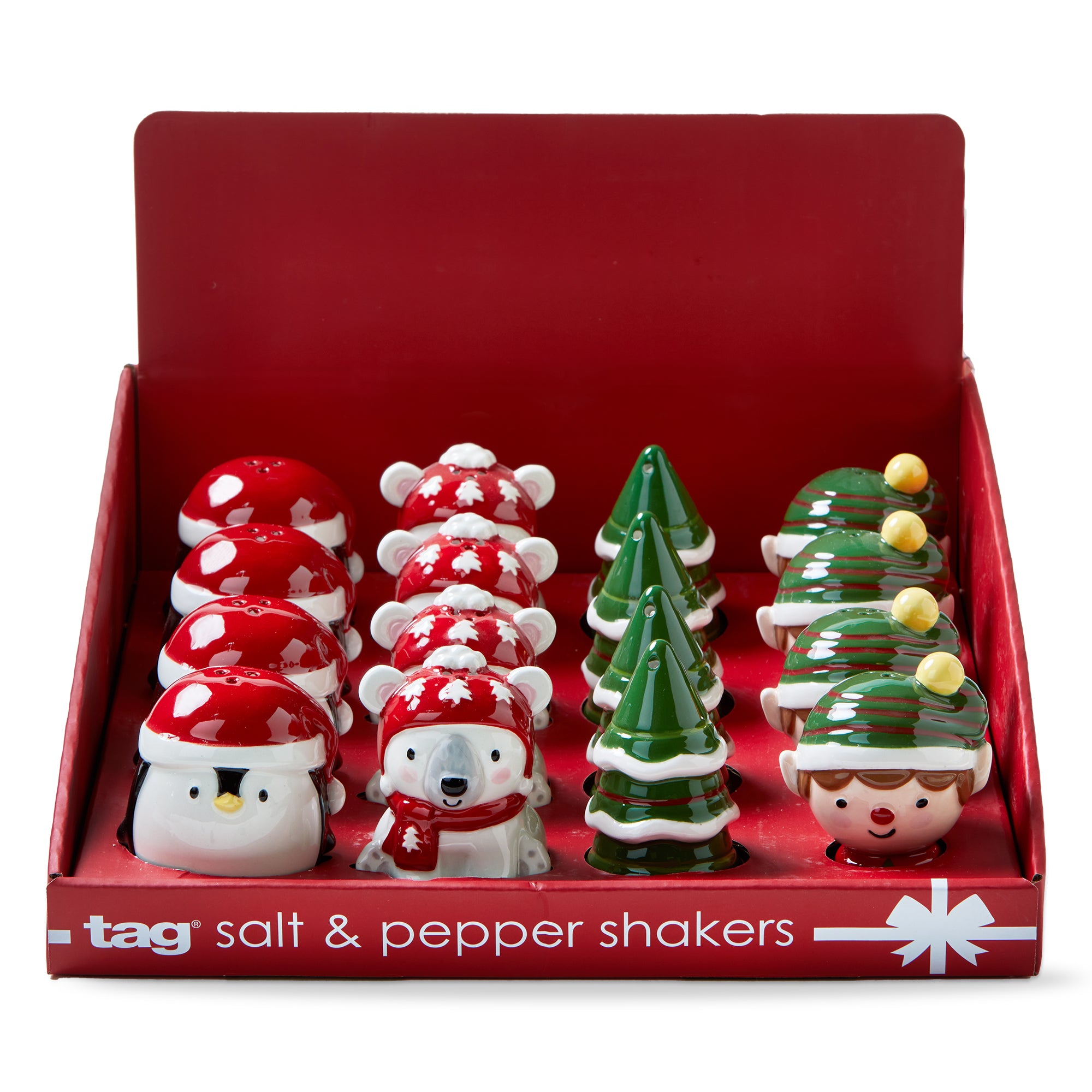 Charming assortment of sculpted holiday salt and pepper shakers including penguin, tree, polar bear, and elf designs. Each piece is hand painted with festive detail and packaged in a ready to display CDU for easy gifting and seasonal merchandising. Hand painted details add warmth while its versatile design makes styling simple. Sized for layered displays and pairs beautifully with seasonal greenery and décor. View all items in Holiday Cheer.
