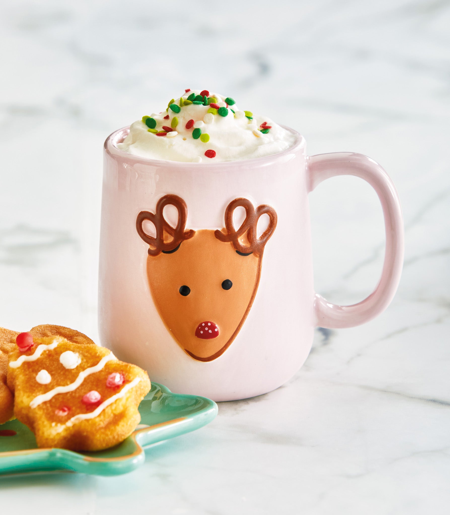 Sculpted reindeer cookie mug with hand painted details and a built in cookie holder slot. A fun and giftable holiday piece that brings playful charm to cocoa bars, breakfast nooks, and seasonal displays. Hand painted details add warmth while its versatile design makes styling simple. Sized for layered displays and pairs beautifully with seasonal greenery and décor. View all items in Sweetest Christmas.