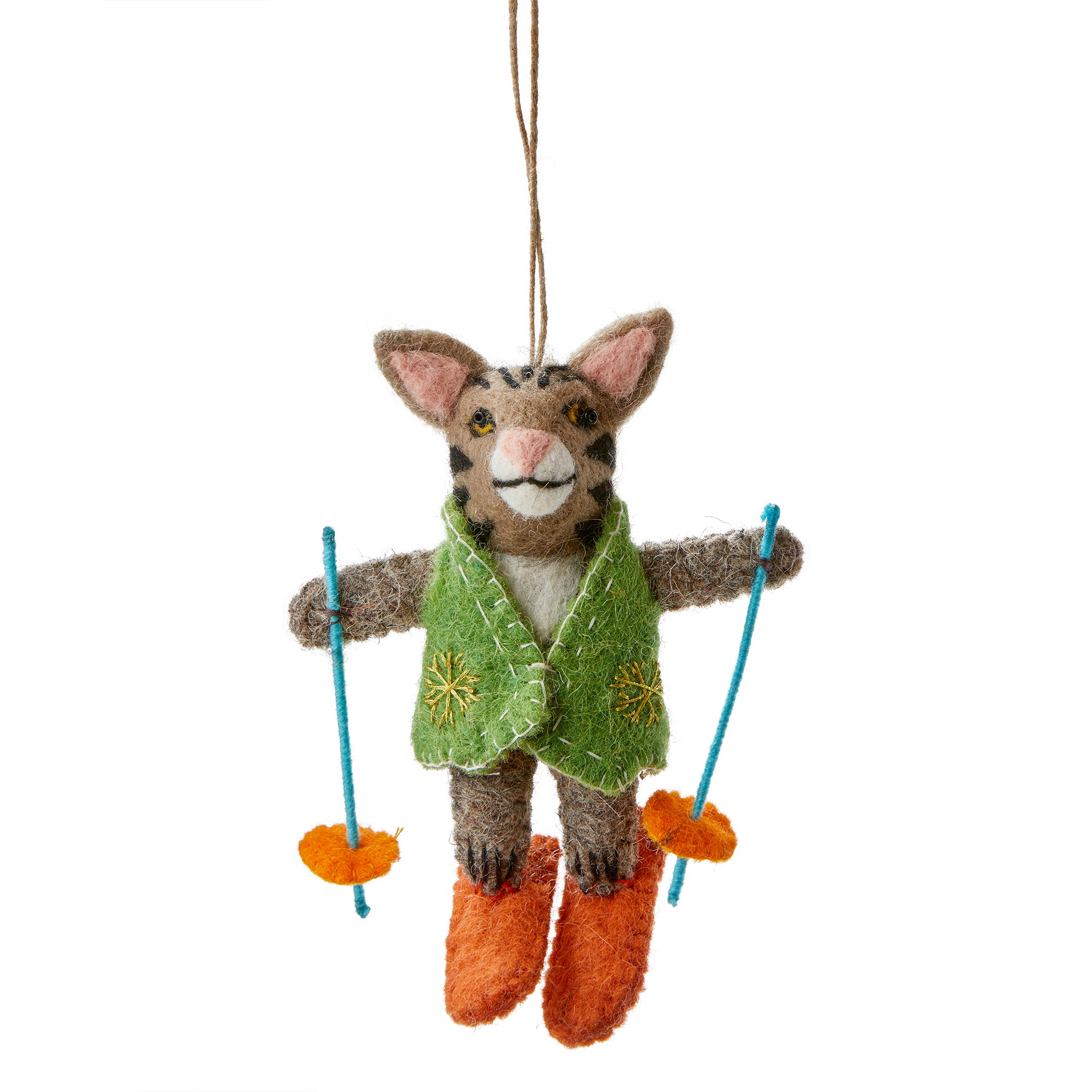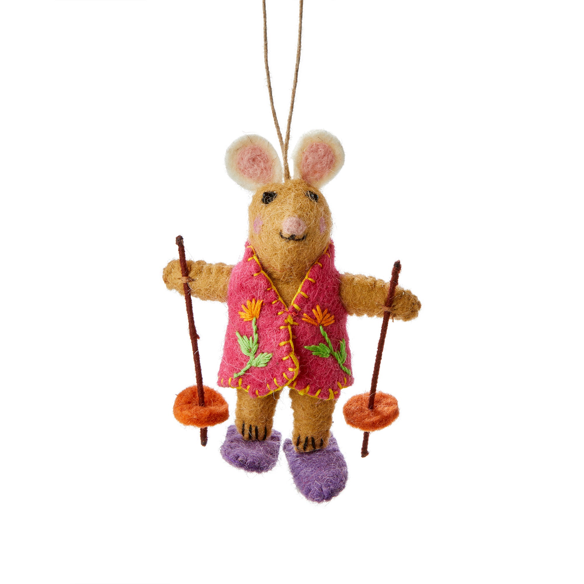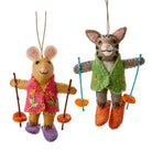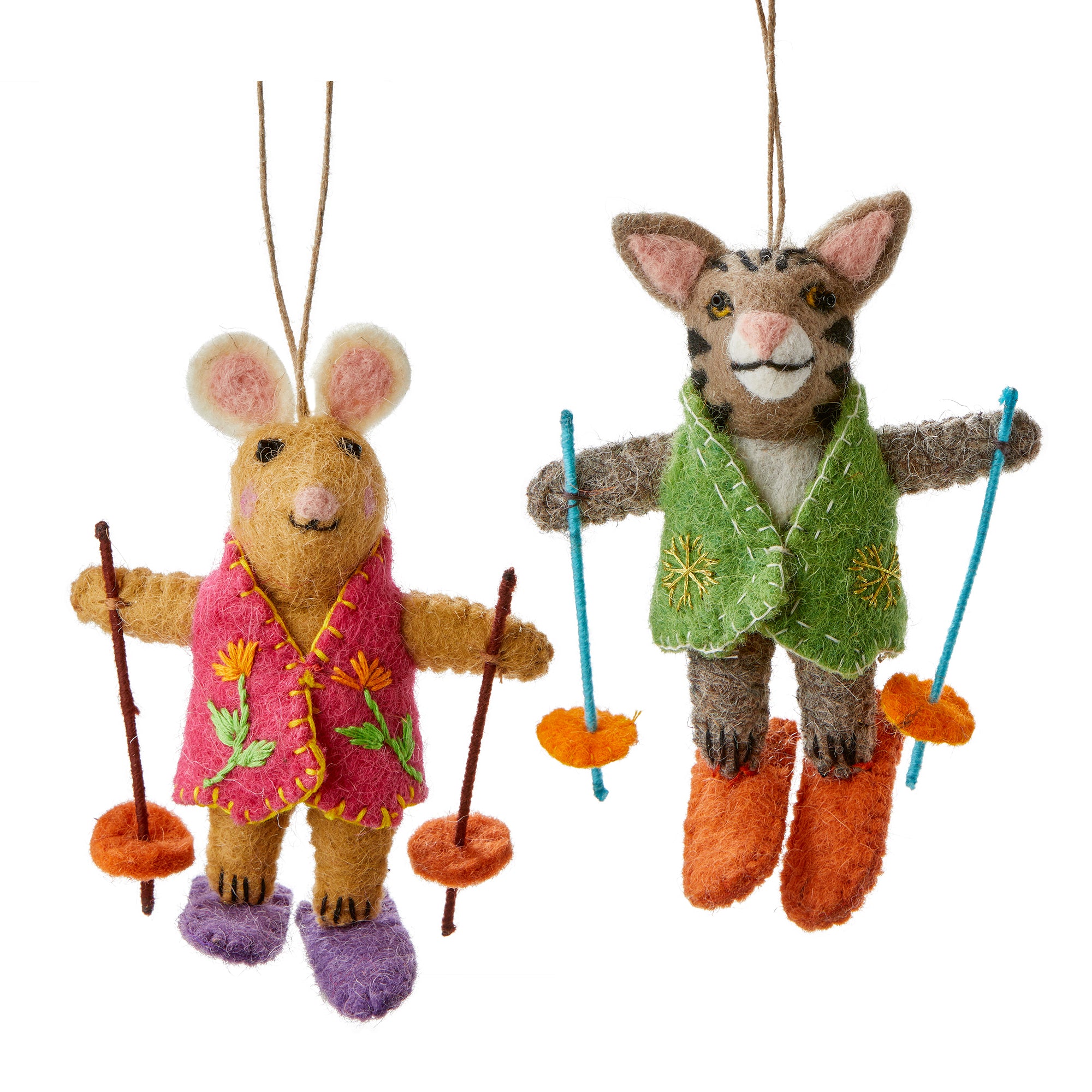 Set of skiing critter felt ornaments featuring a playful cat and mouse on tiny skis. These charming characters bring movement and whimsy to holiday branches. Hand painted details add warmth while its versatile design makes styling simple. Sized for layered displays and pairs beautifully with seasonal greenery and décor. View all items in Ornaments.