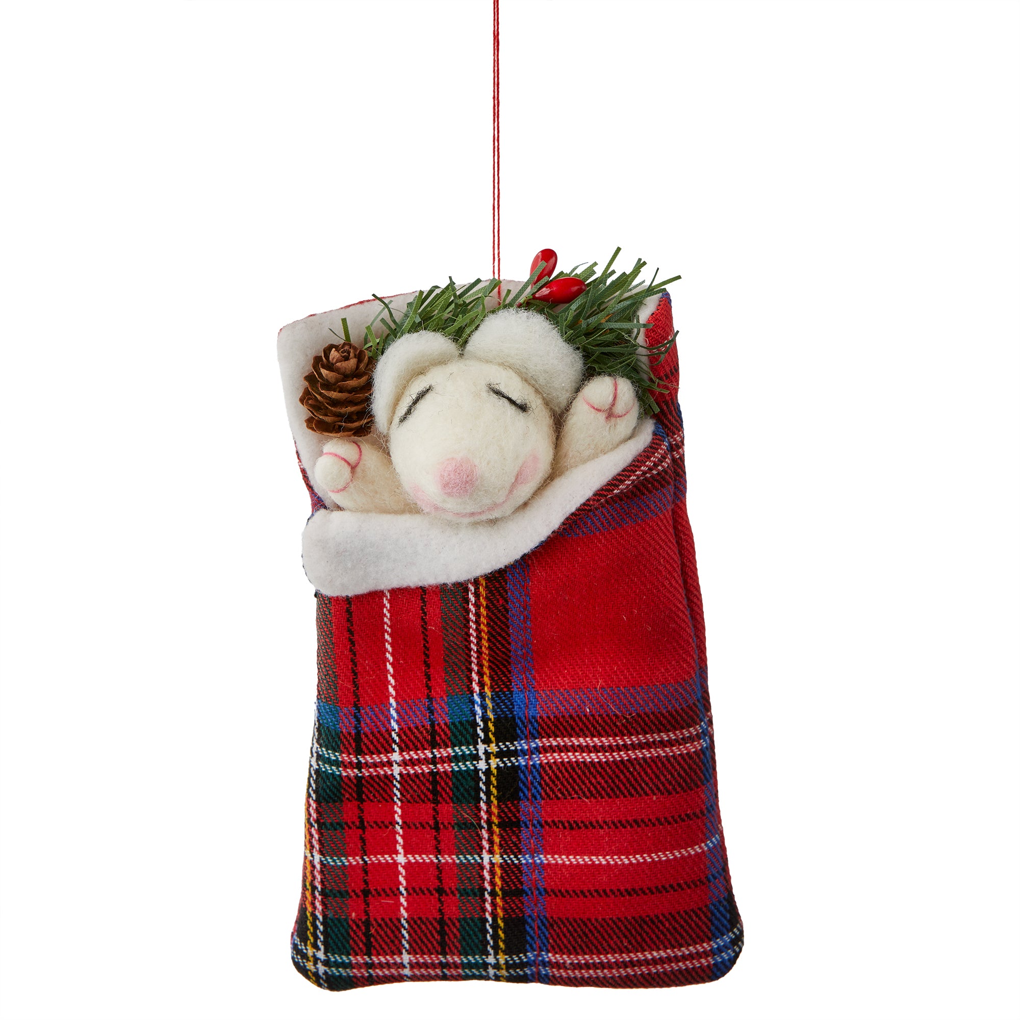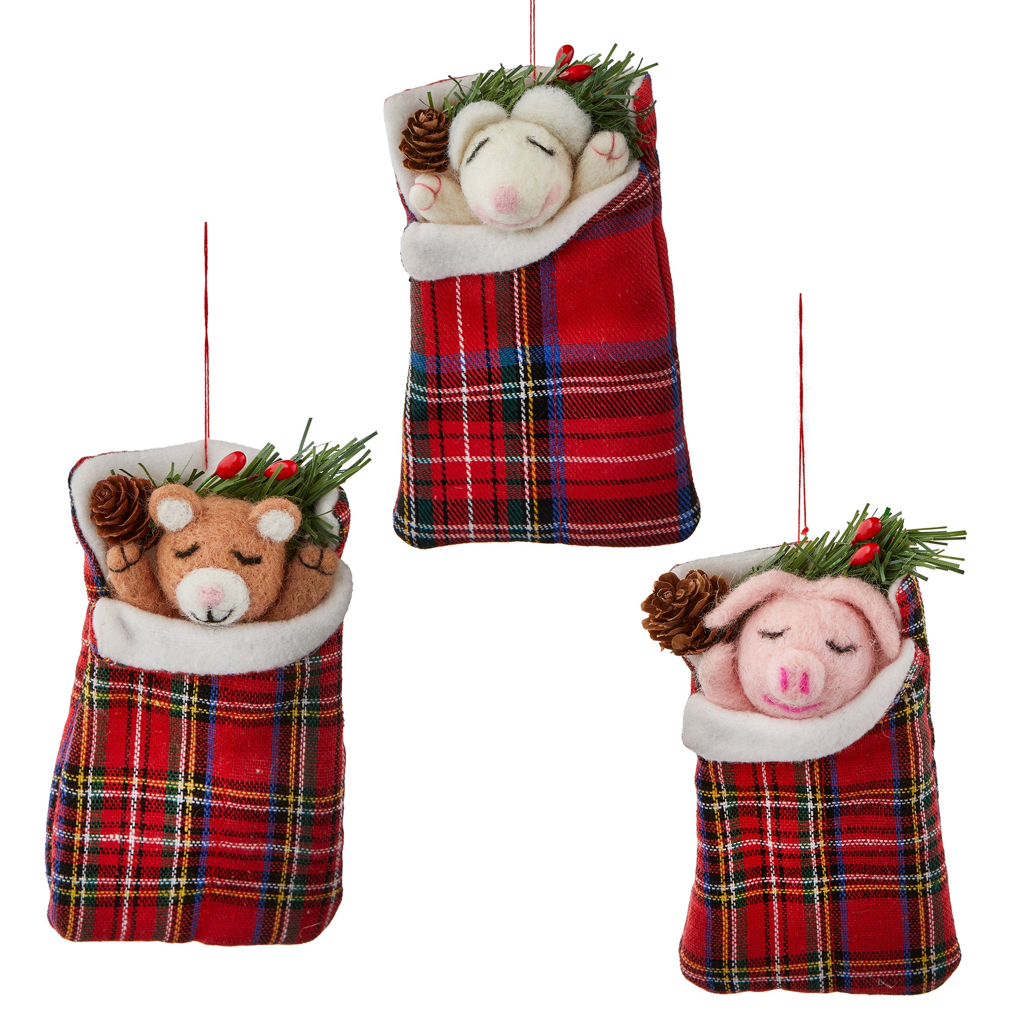 Sleeping bag friend ornament assortment with woodland characters tucked into patterned sleeping bags. A charming campout story for holiday trees and kids rooms. Hand painted details add warmth while its versatile design makes styling simple. Sized for layered displays and pairs beautifully with seasonal greenery and décor. View all items in Ornaments.