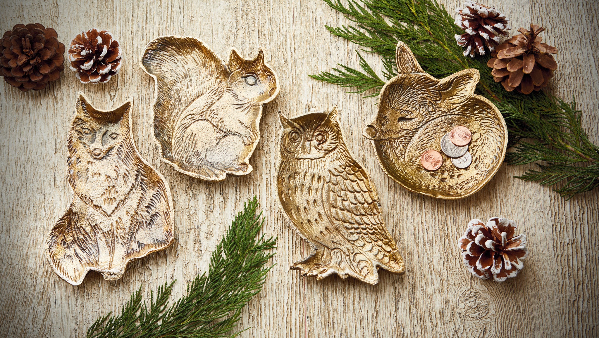 Cast aluminum squirrel trinket dish with charming hand sculpted details. The metallic finish adds woodland warmth to vanities, dressers or gift sets. Perfect for holding jewelry or keys. Hand painted details add warmth while its versatile design makes styling simple. Sized for layered displays and pairs beautifully with seasonal greenery and décor. View all items in Northern Forest.