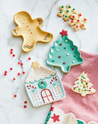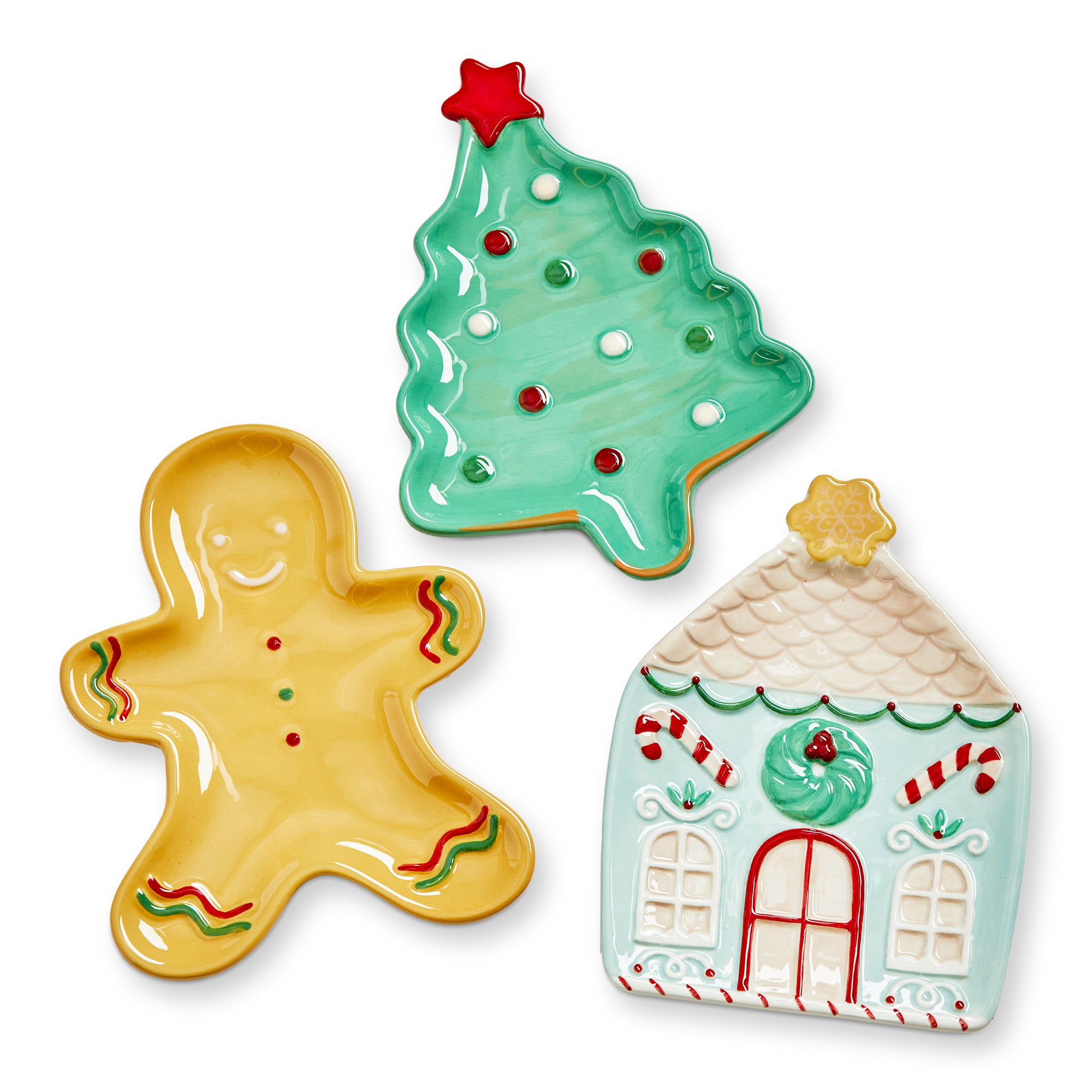 Set of three sculpted Sweetest Christmas appetizer plates shaped like a tree, gingerbread man, and house. Hand painted with charming detail, perfect for cookies, treats, or holiday entertaining. Hand painted details add warmth while its versatile design makes styling simple. Sized for layered displays and pairs beautifully with seasonal greenery and décor. View all items in Sweetest Christmas.