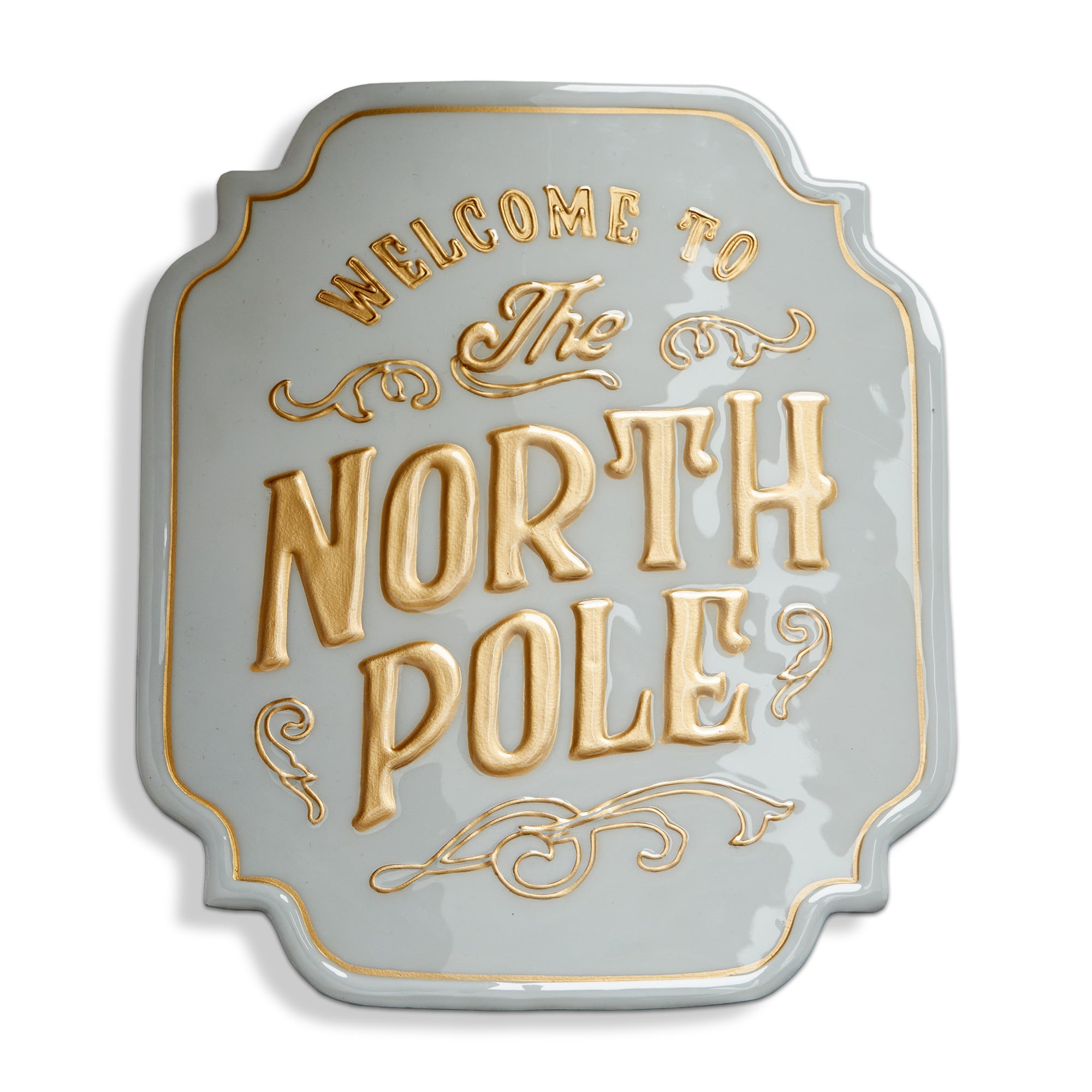 Hand painted metal wall sign welcomes all to the North Pole with friendly vintage style. Hand painted details add warmth while its versatile design makes styling simple. Sized for layered displays and pairs beautifully with seasonal greenery and décor. View all items in Wonderful Christmastime.