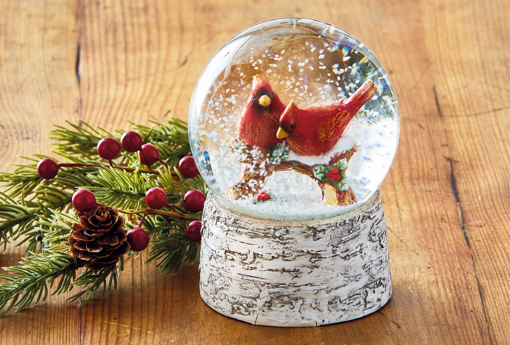 Winter cardinals snow globe featuring two bright birds perched among snowy branches. Shake to watch gentle flurries swirl around this peaceful scene. Hand painted details add warmth while its versatile design makes styling simple. Sized for layered displays and pairs beautifully with seasonal greenery and décor. View all items in Winter Berries.