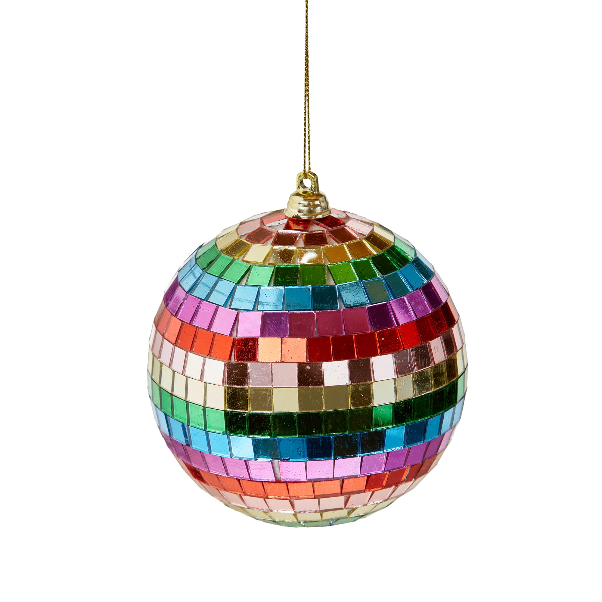 Multicolor disco ball ornament handcrafted with glass facets for a bright, retro inspired shimmer. Perfect for trees, garlands, gift topping, or festive home décor. Hand painted details add warmth while its versatile design makes styling simple. Sized for layered displays and pairs beautifully with seasonal greenery and décor. View all items in Groovy Christmas.