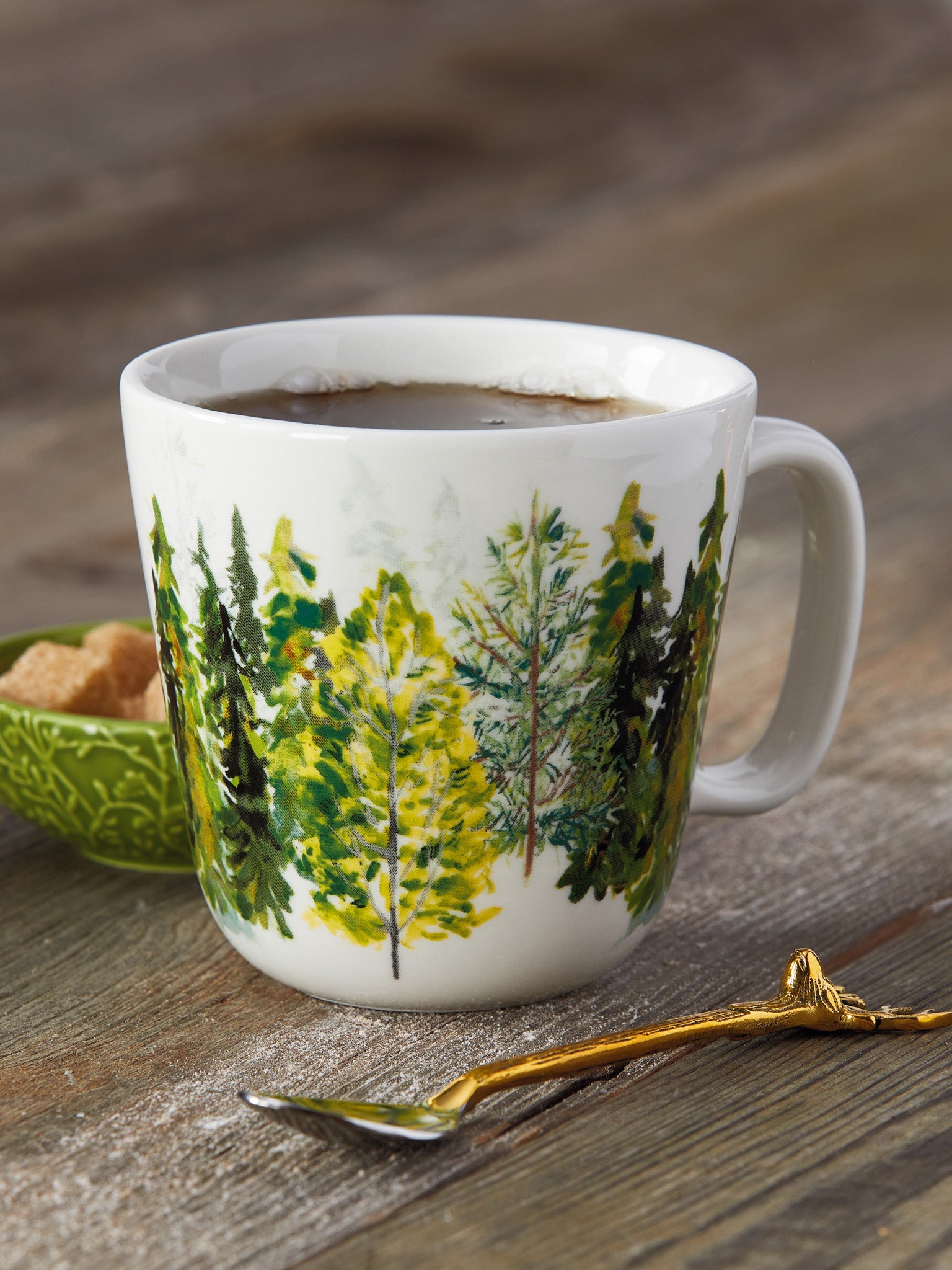 Northern Forest mug with wraparound evergreen artwork. A cozy winter favorite for coffee, cocoa, and seasonal gifting. Hand painted details add warmth while its versatile design makes styling simple. Sized for layered displays and pairs beautifully with seasonal greenery and décor. View all items in Northern Forest.