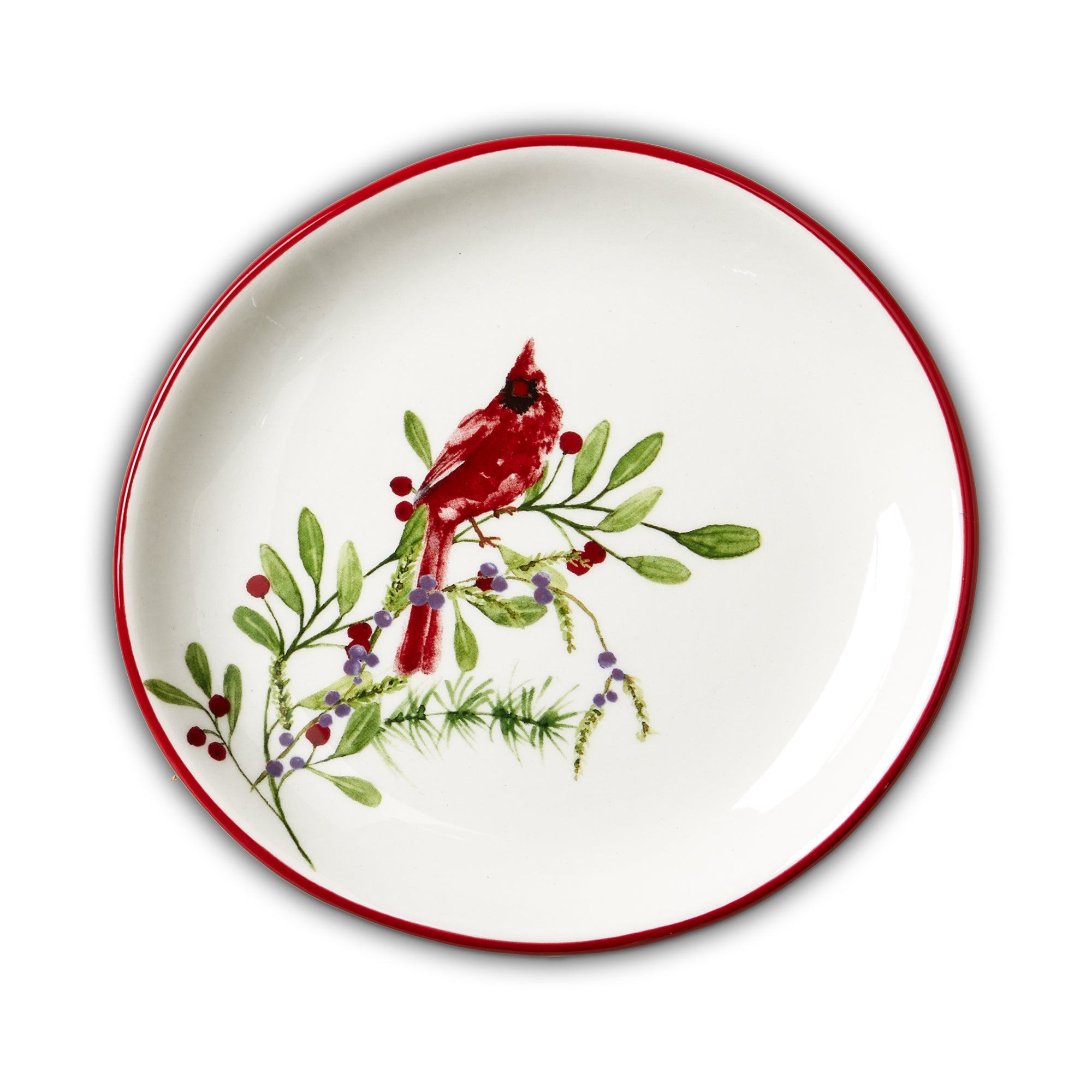 Winter cardinal appetizer plate that brings nature inspired charm to holiday tables. Hand painted details add warmth while its versatile design makes styling simple. Sized for layered displays and pairs beautifully with seasonal greenery and décor. View all items in Winter Berries.