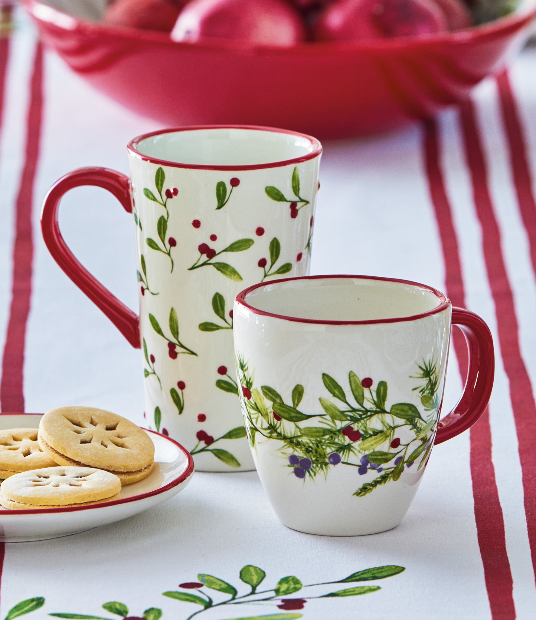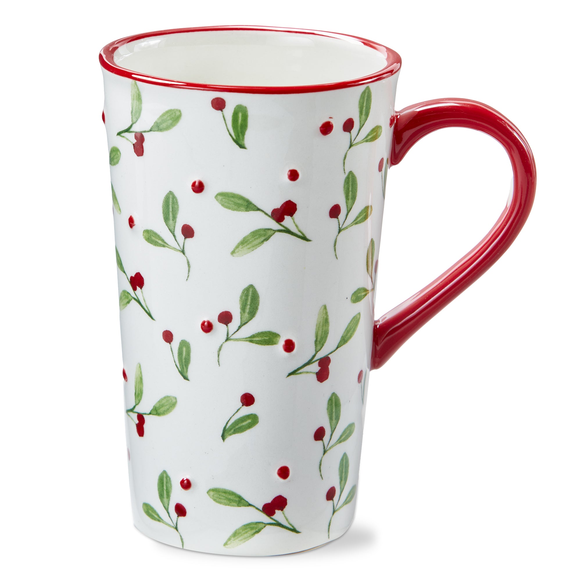 Tall winter sprig mug with elegant hand painted greenery, offering a modern holiday look in a tall, comfortable silhouette perfect for lattes or tea. Hand painted details add warmth while its versatile design makes styling simple. Sized for layered displays and pairs beautifully with seasonal greenery and décor. View all items in Winter Berries.