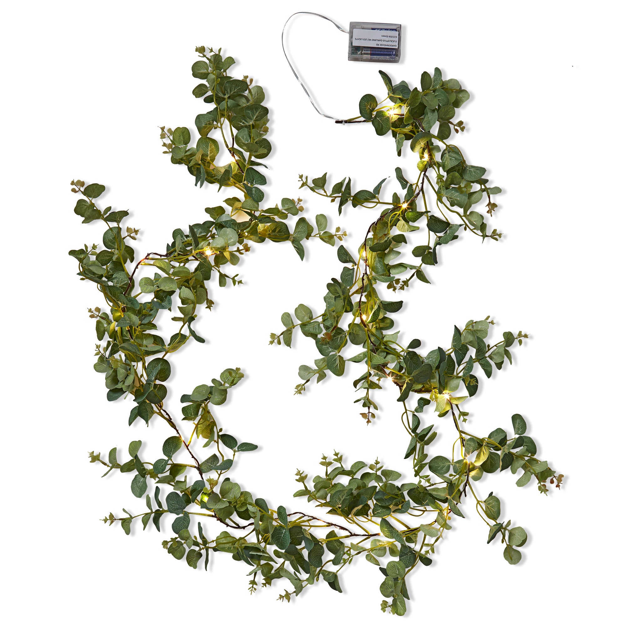 Turn any space in your home into an enchanted escape. this lush eucalyptus garland is a perfect way to bring the outdoors in and each strand features led lights for an added touch of whimsy. this garland requires three aa batteries and can be toggled between on, off, or a six-hour timer. each piece features 20 lights that give off a warm glow. dust to clean.