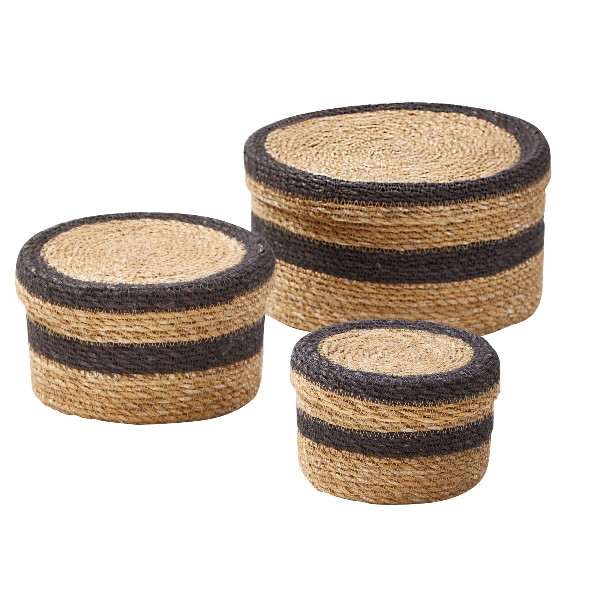 These round seagrass storage boxes with lids are perfect for storing small items, such as jewelry, coins, or hair accessories. they can also be used to hold snacks or candy. the boxes are also great for displaying succulents or other small plants.