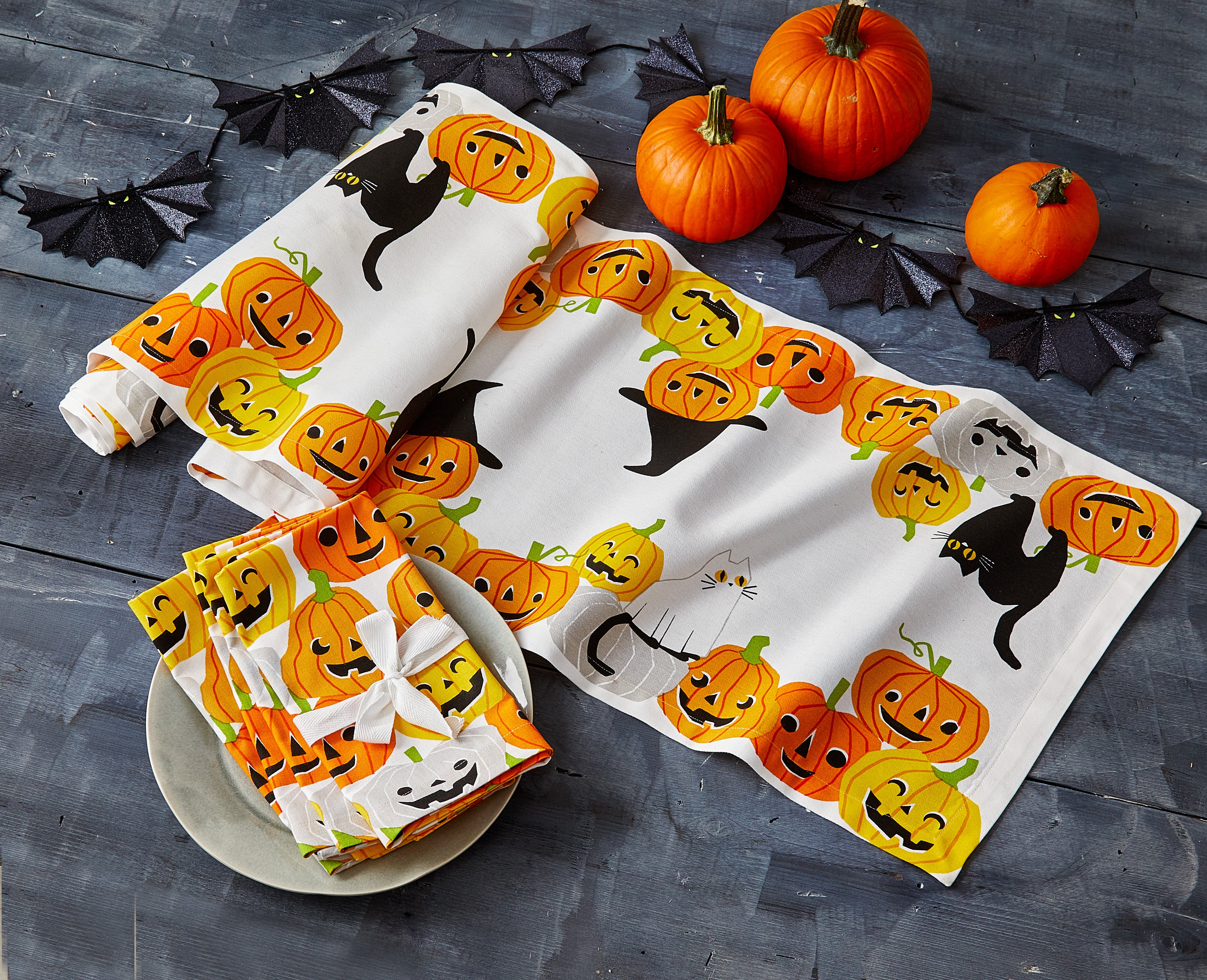 Pumpkin Patch napkin set brings hand printed pumpkins to autumn place settings giving everyday dinners and holiday meals a festive update. Hand painted details add warmth while its versatile design makes styling simple. Sized for layered displays and pairs beautifully with seasonal greenery and décor. View all items in Boo Crew.