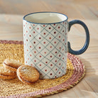 A neutral-toned mug with a stamped diamond grid pattern and contrasting navy handle—elegant and understated. View all items in Cafe Nook.