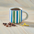 Small but bold, this espresso cup features vertical watercolor stripes in cool tones. View all items in Cafe Nook.