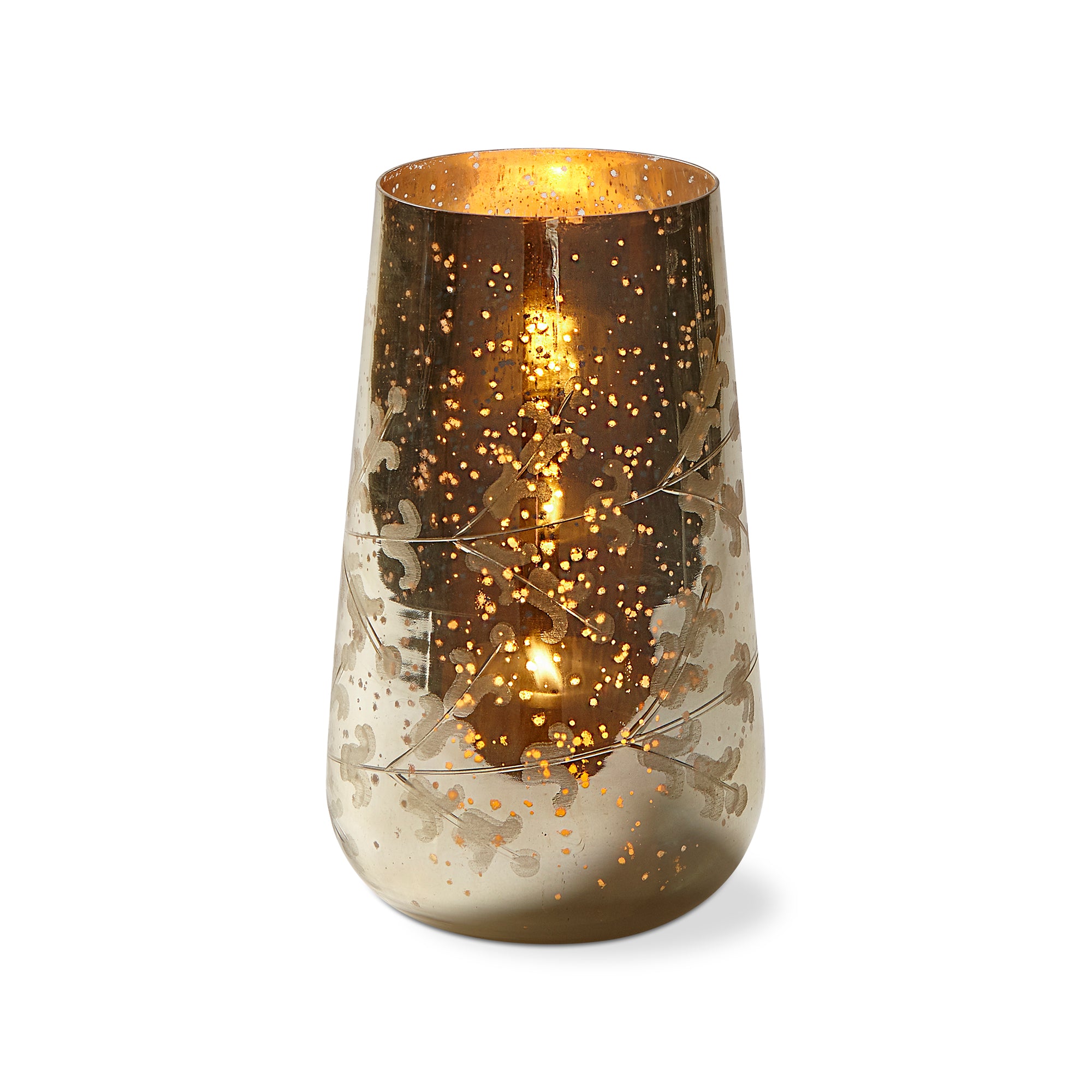 A decorative antique gold leaf hurricane perfect for styling the home or special events from parties to weddings. features mouth blown, hand etched design, spray glass. can use with standard size tealight, votive, or 3" pillar candle.