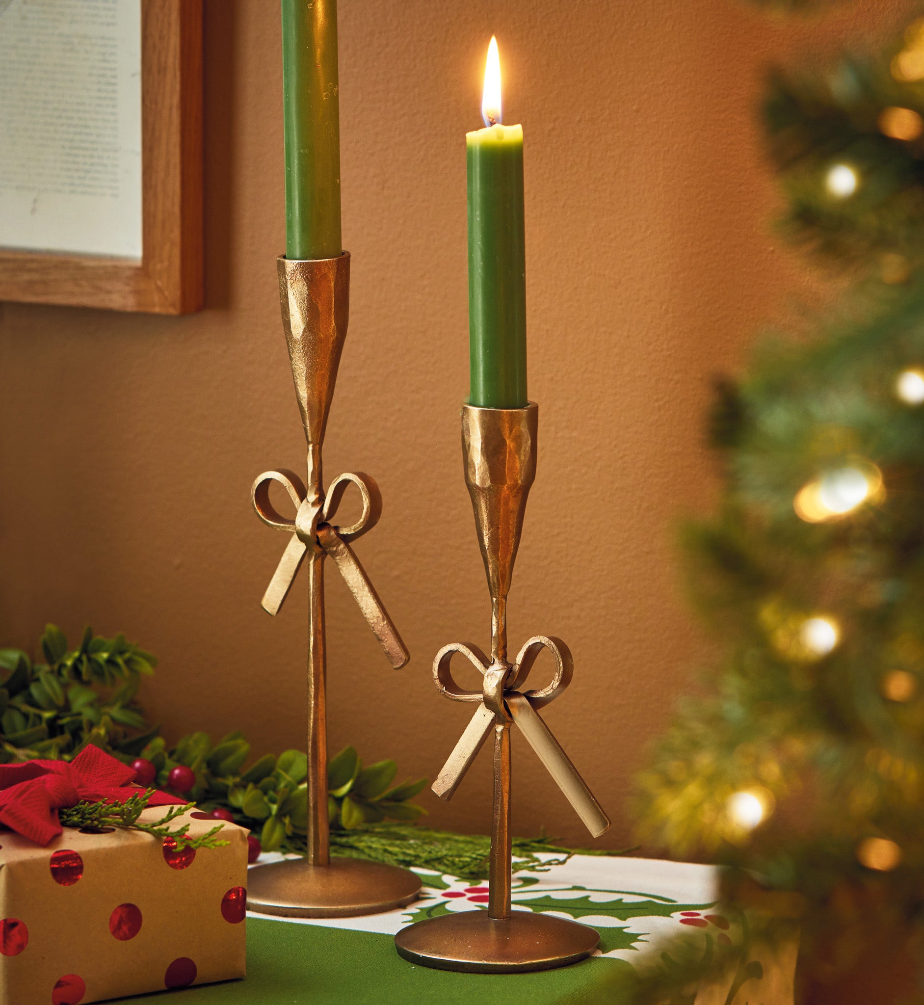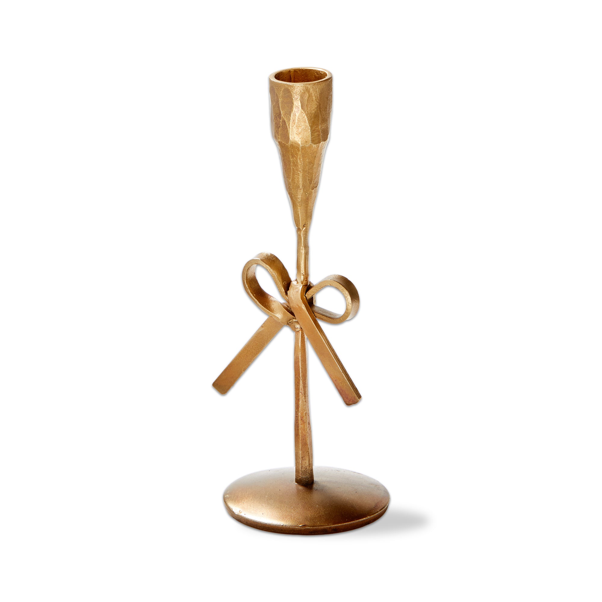 The smaller bow taper holder offers the same timeless brass look in a compact size. Hand painted details add warmth while its versatile design makes styling simple. Sized for layered displays and pairs beautifully with seasonal greenery and décor.
