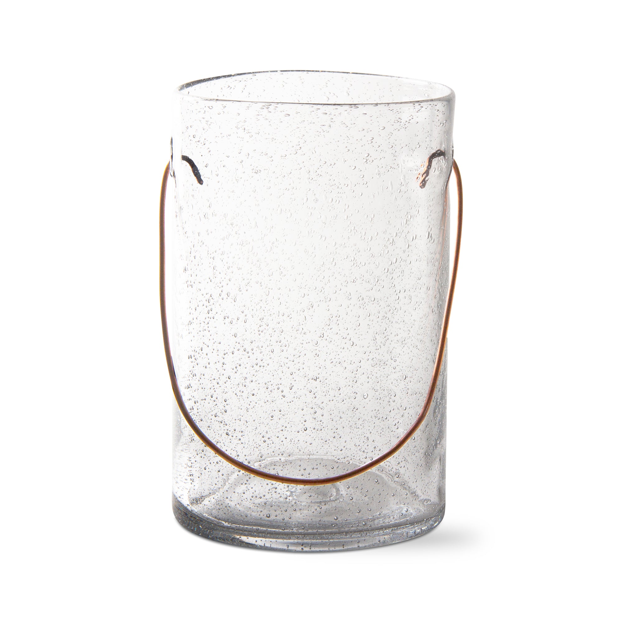 Decorative large sized bubble glass holder perfect for styling the home or special events from parties to weddings. each glass is handcrafted and designed with hundreds of miniature bubbles, forming unique patterns and optical effects. fire drilled holes for the copper handles. holds up to a 3” pillar candle, standard size votive candle, tealight or led votive candle.