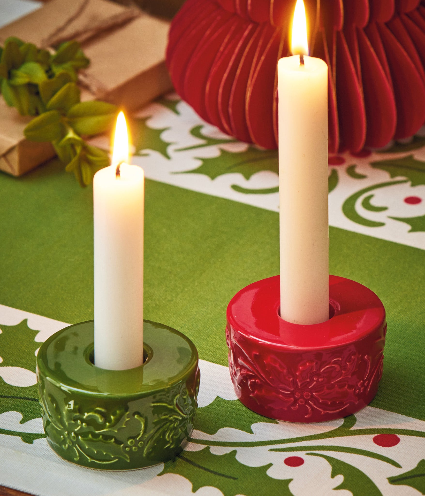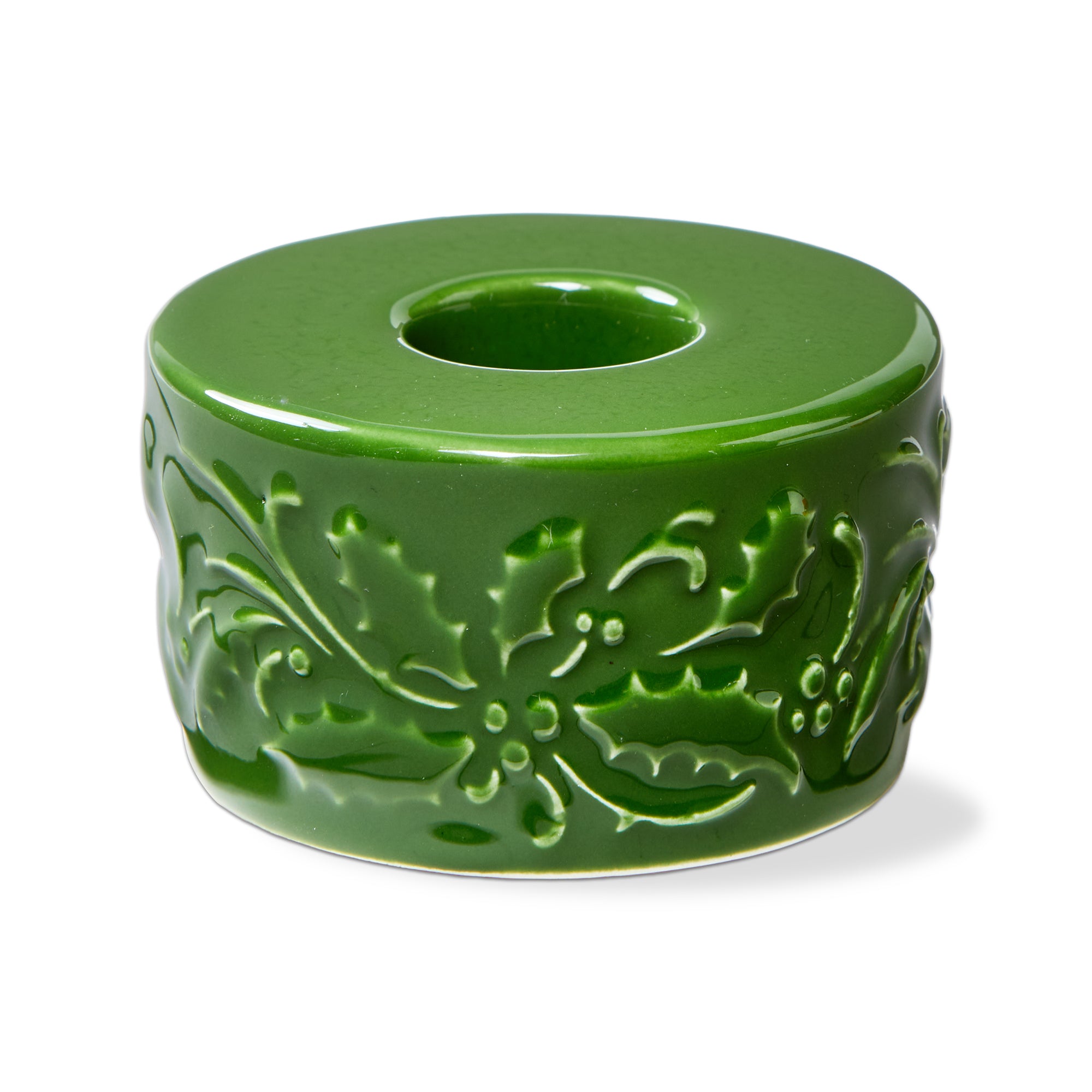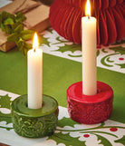 Embossed green earthenware taper holder that feels like a vintage treasure on holiday tables. Hand painted details add warmth while its versatile design makes styling simple. Sized for layered displays and pairs beautifully with seasonal greenery and décor.