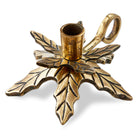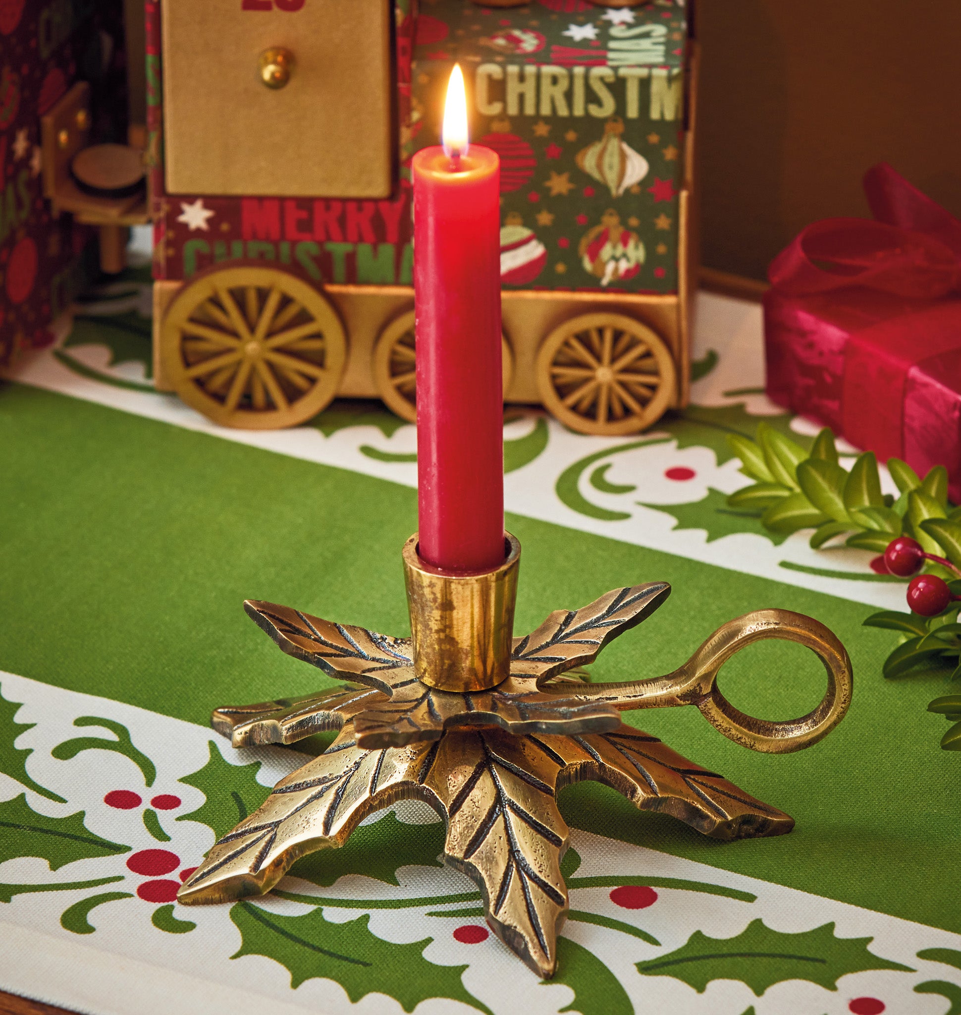 Classic antique brass chamberstick taper holder that adds vintage charm to mantels and tables. The sculpted form pairs with any standard taper and creates a warm winter glow. A timeless piece for holiday or everyday styling. Hand painted details add warmth while its versatile design makes styling simple. Sized for layered displays and pairs beautifully with seasonal greenery and décor.
