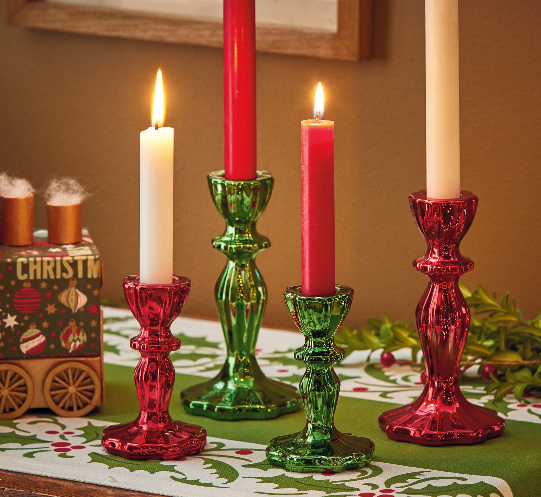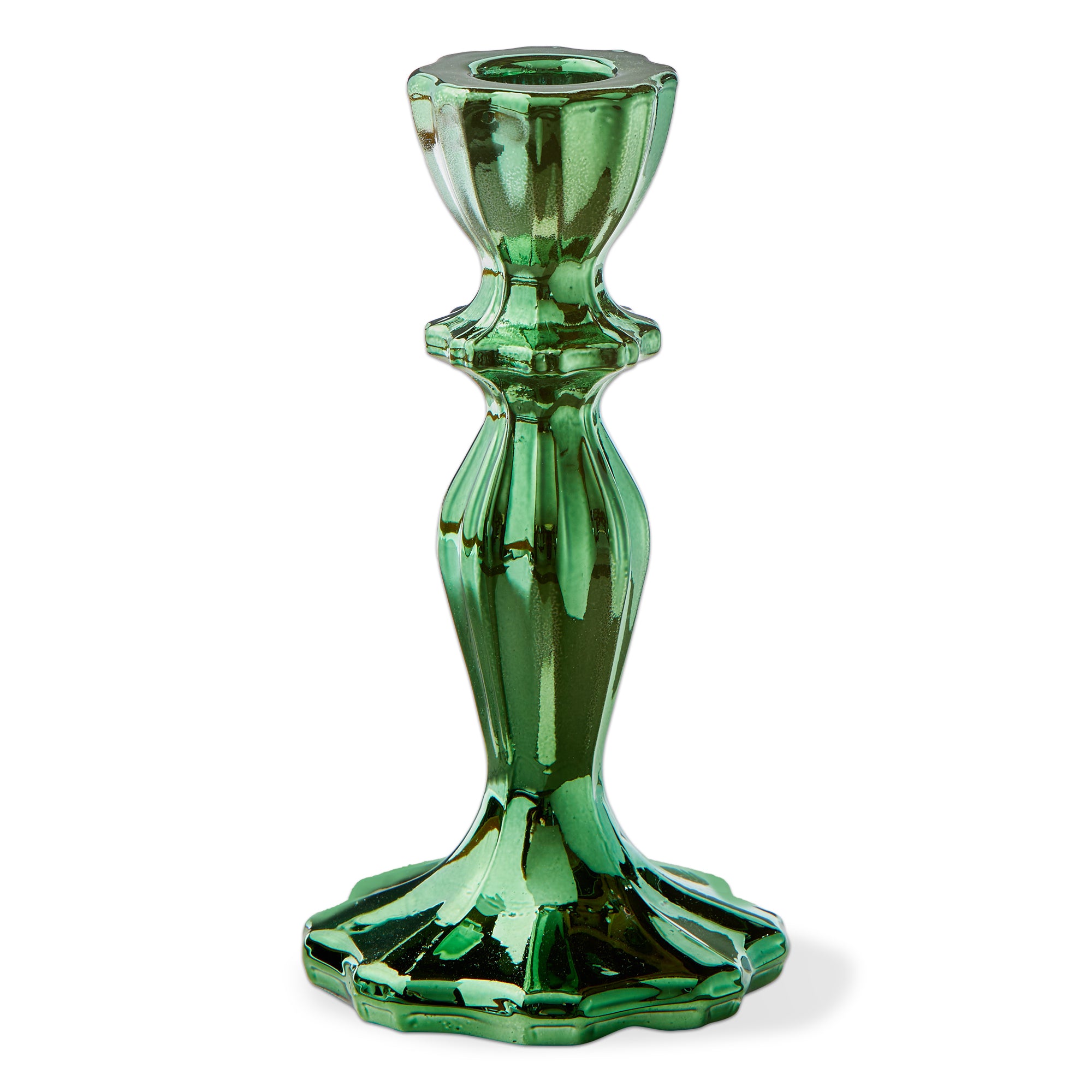 The green mercury glass taper holder adds jewel tone shine to mantels and dinner tables. Hand painted details add warmth while its versatile design makes styling simple. Sized for layered displays and pairs beautifully with seasonal greenery and décor.