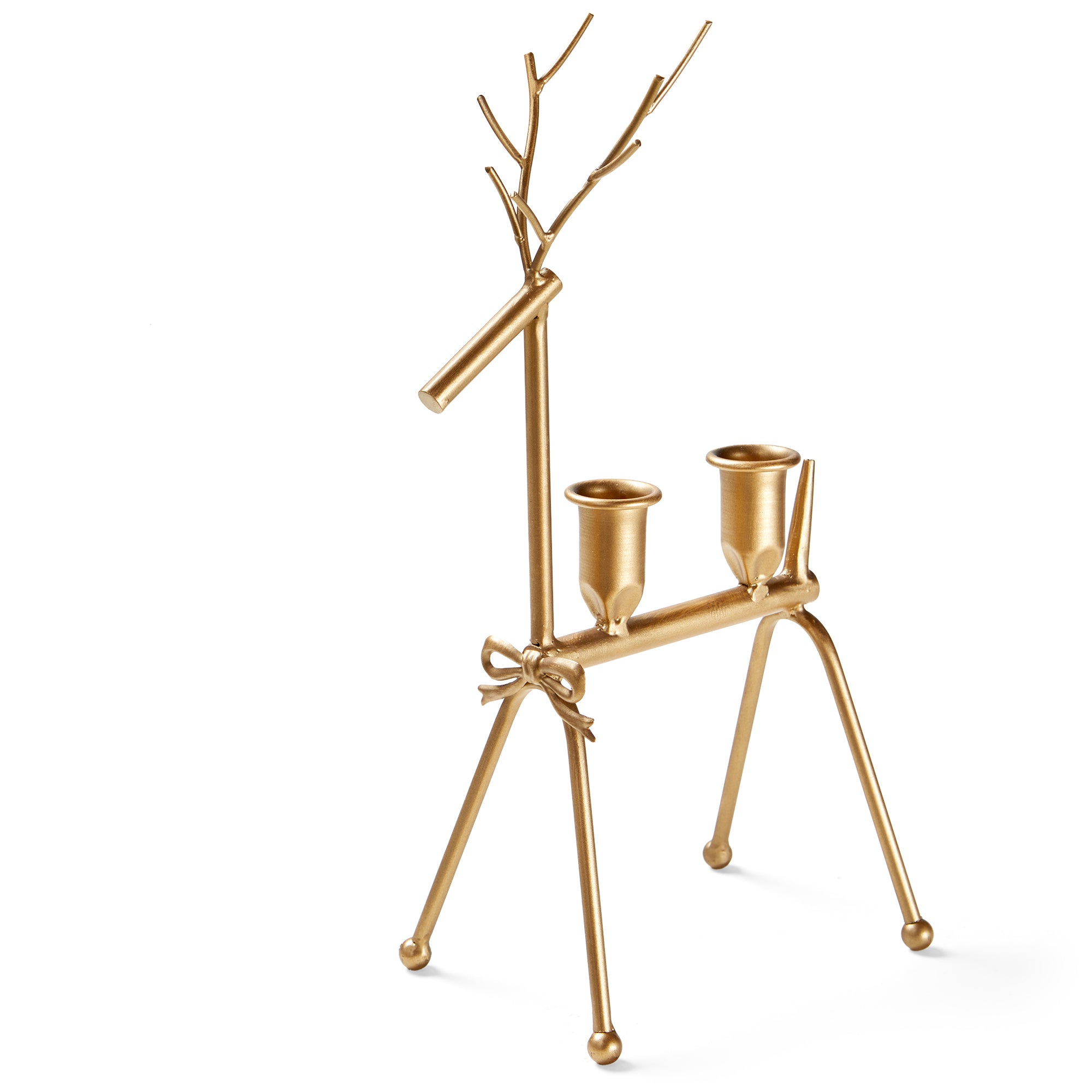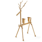 Brass reindeer double taper holder with playful sculpted legs and antlers. Holds two standard tapers and creates a whimsical centerpiece for holiday dining or mantel styling. Hand painted details add warmth while its versatile design makes styling simple. Sized for layered displays and pairs beautifully with seasonal greenery and décor.