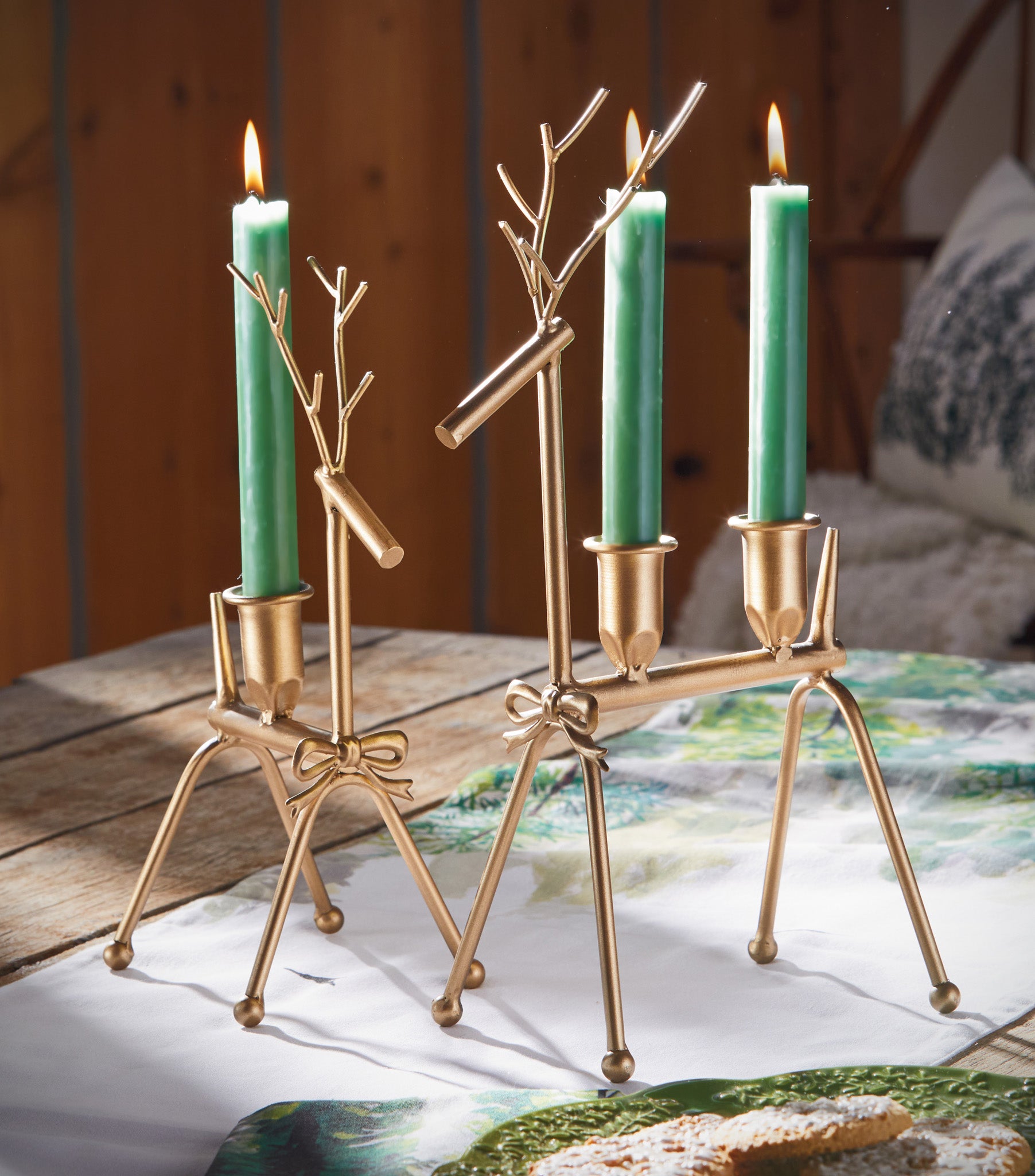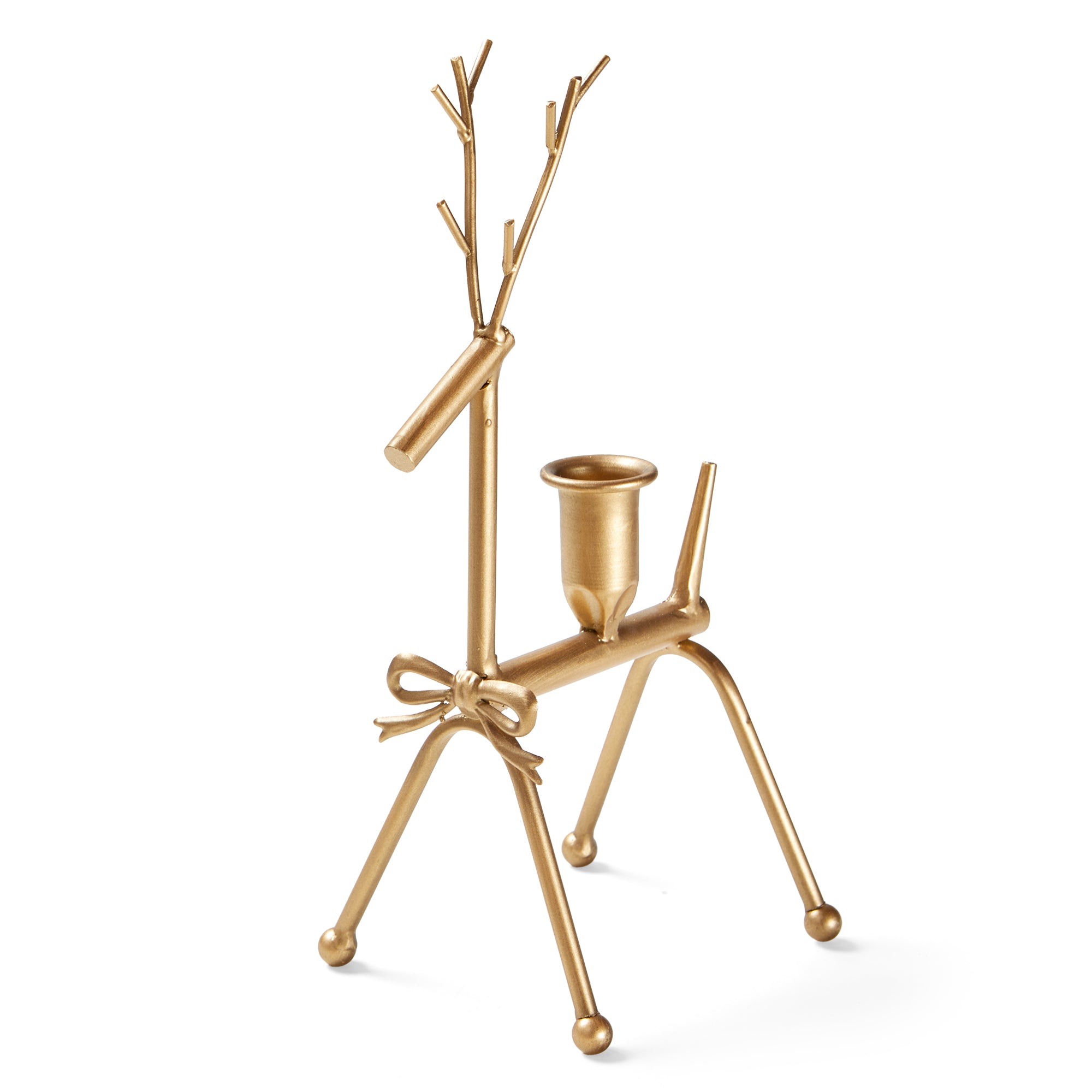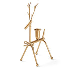 Single brass reindeer taper holder designed with charming sculpted details. Holds a standard taper and pairs beautifully with the double version for a layered holiday display. Hand painted details add warmth while its versatile design makes styling simple. Sized for layered displays and pairs beautifully with seasonal greenery and décor.