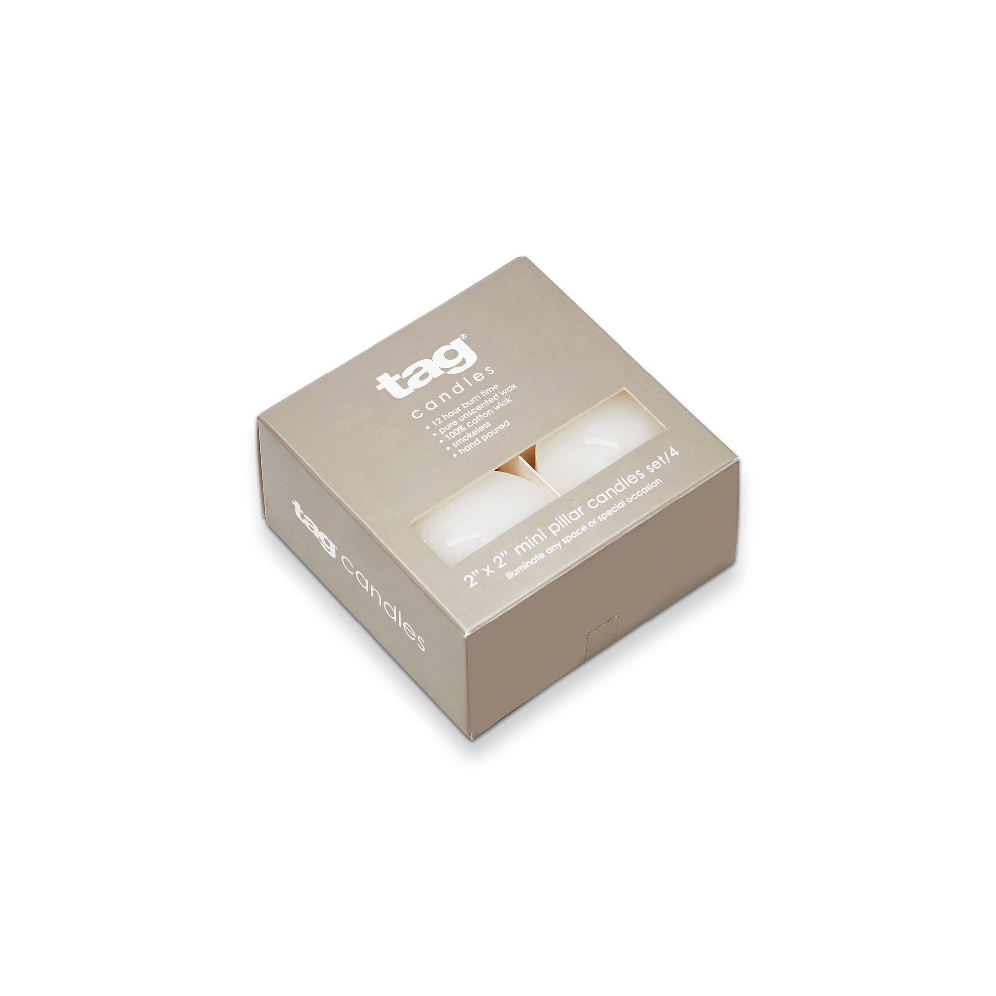 Perfectly timeless, this is a fresh new look with the same great quality of tag's classic chapel candles you've come to know & love! beautifully crafted of pure, unscented paraffin wax, each candle provides clear, beautiful light. our signature mini white pillar is perfect to use all year round.