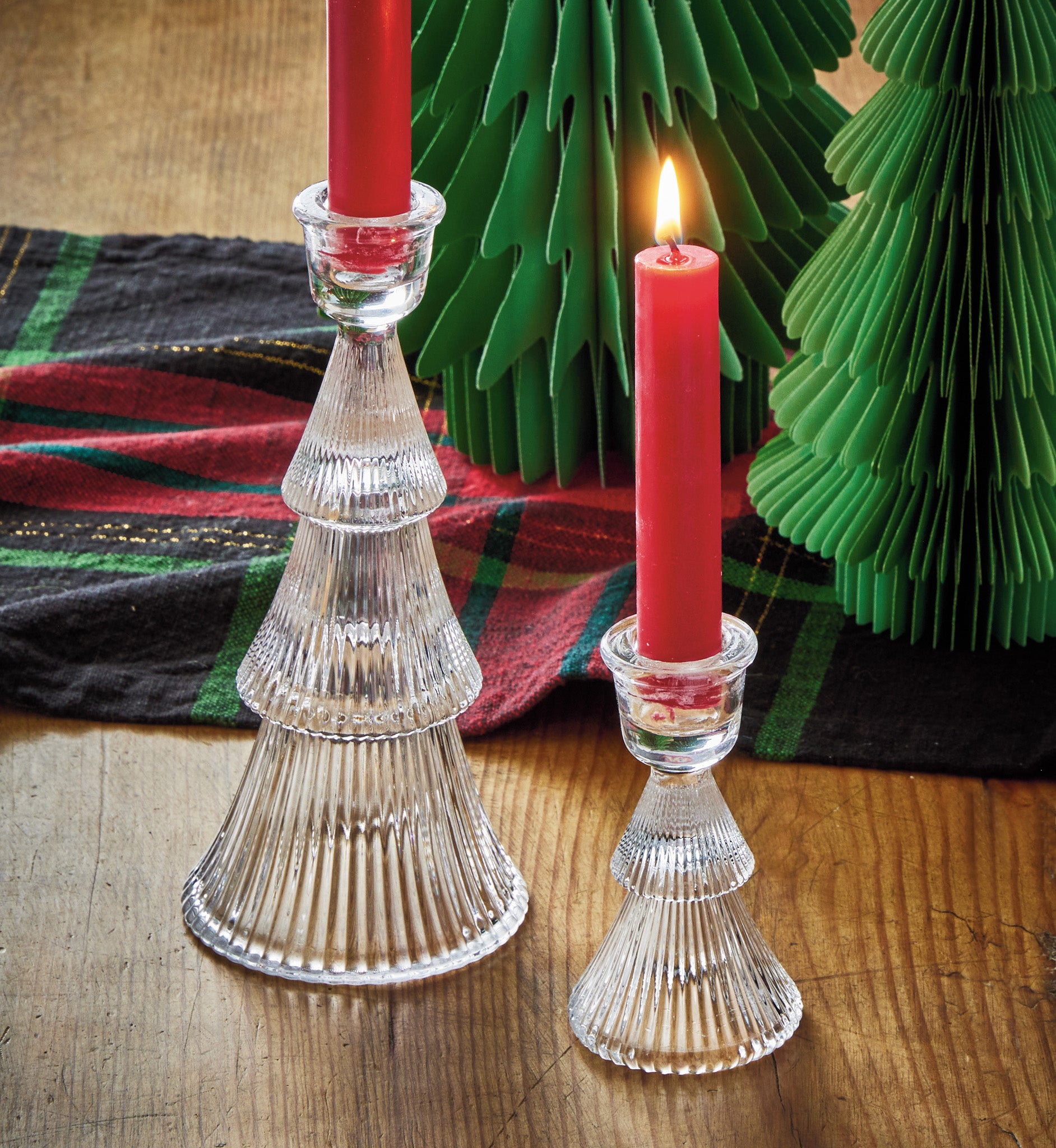 Add a touch of elegance to your holiday decor with this Glass Ribbed Tree Taper Holder. Made from soda lime glass, this holder is shaped like a Christmas tree and is perfect for holding a 10-inch taper candle. View all items in Wonderful Christmastime.