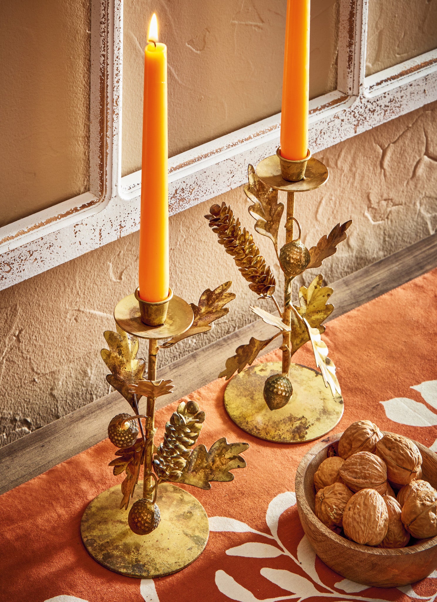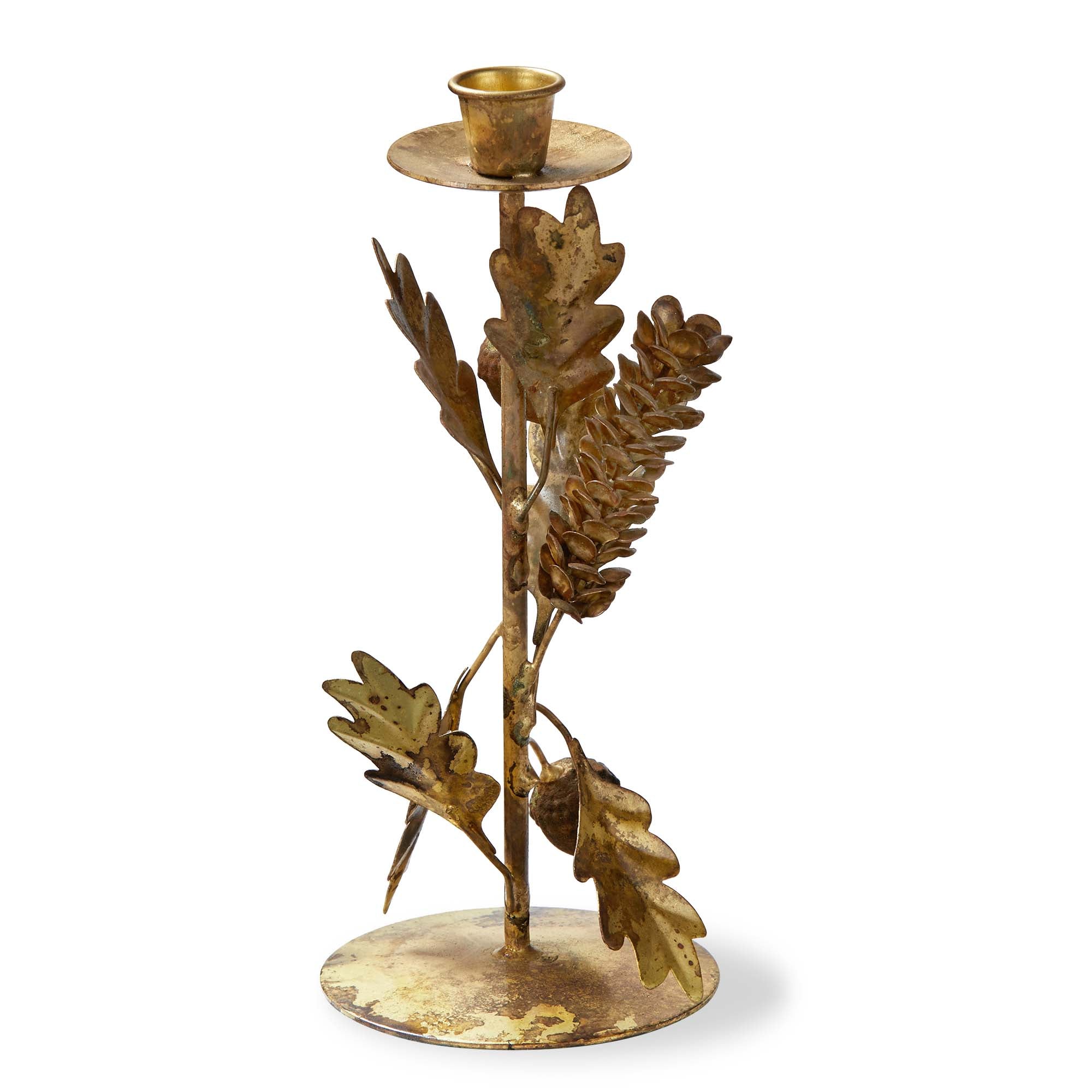 Add a touch of nature to your home decor with this Oak Leaf & Acorn Taper Holder. Crafted from iron with an antique brass finish, this holder features a detailed oak leaf and acorn design, perfect for holding a standard taper candle.