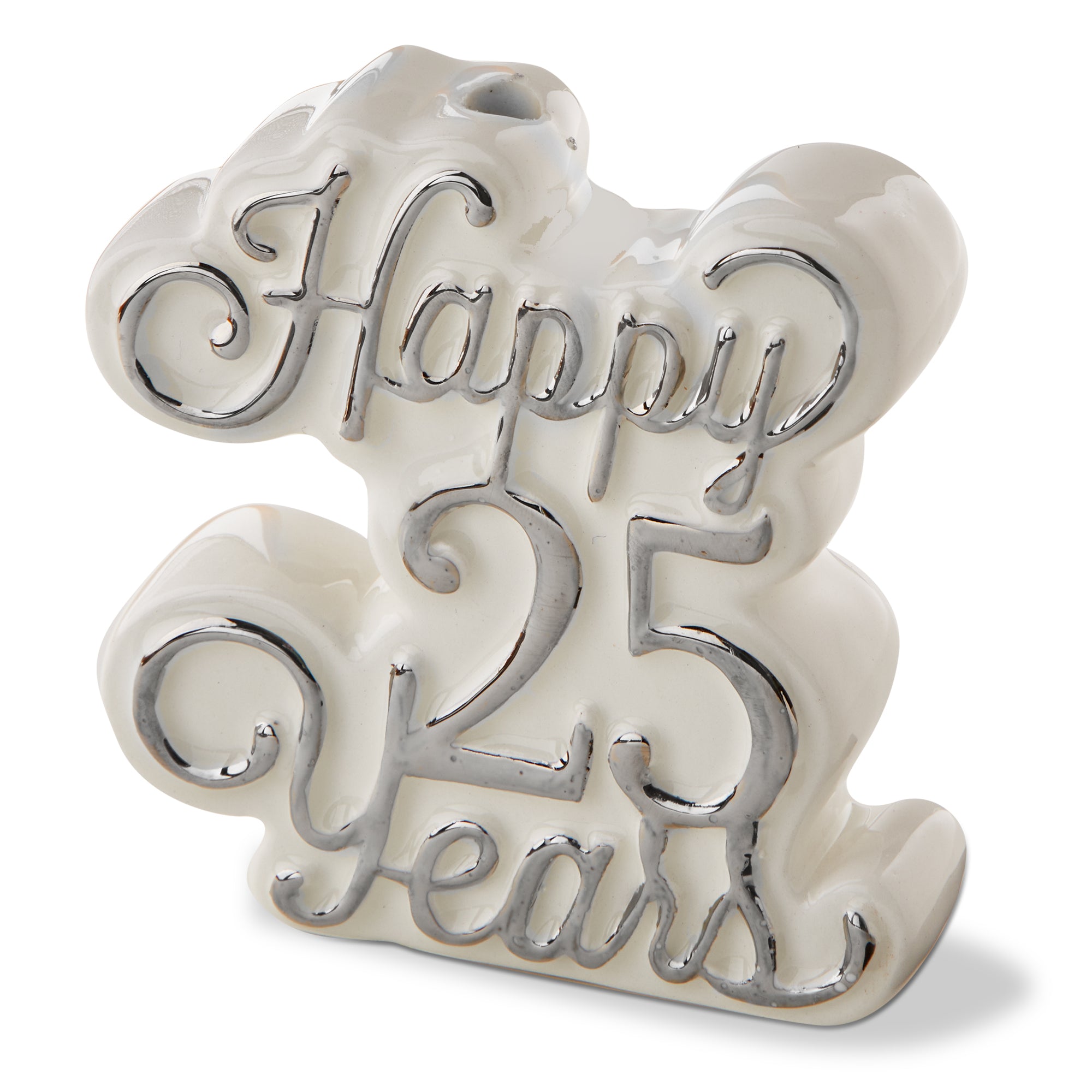 Happy Twenty Five Years Cake Topper Candleholder features elegant silver script with a candle cup. Perfect for a quarter century celebration, dessert table styling, or a keepsake gift. View all items in Celebration.