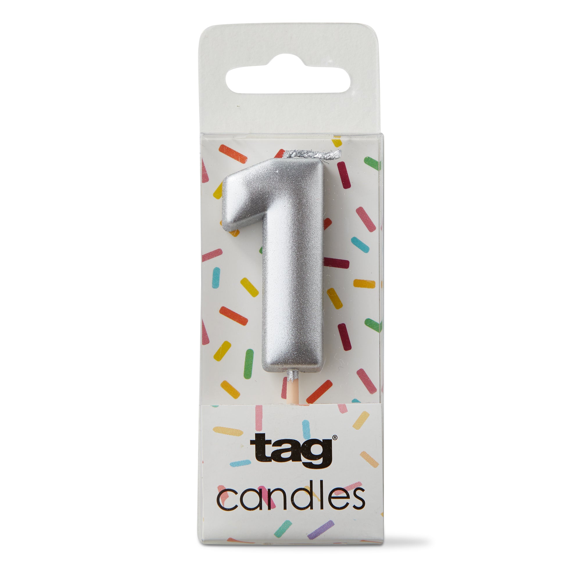 Metallic Digit 1 Candle in silver paraffin with cotton wick and plastic pick stand. Perfect for first birthdays and first milestones. View all items in Celebration.