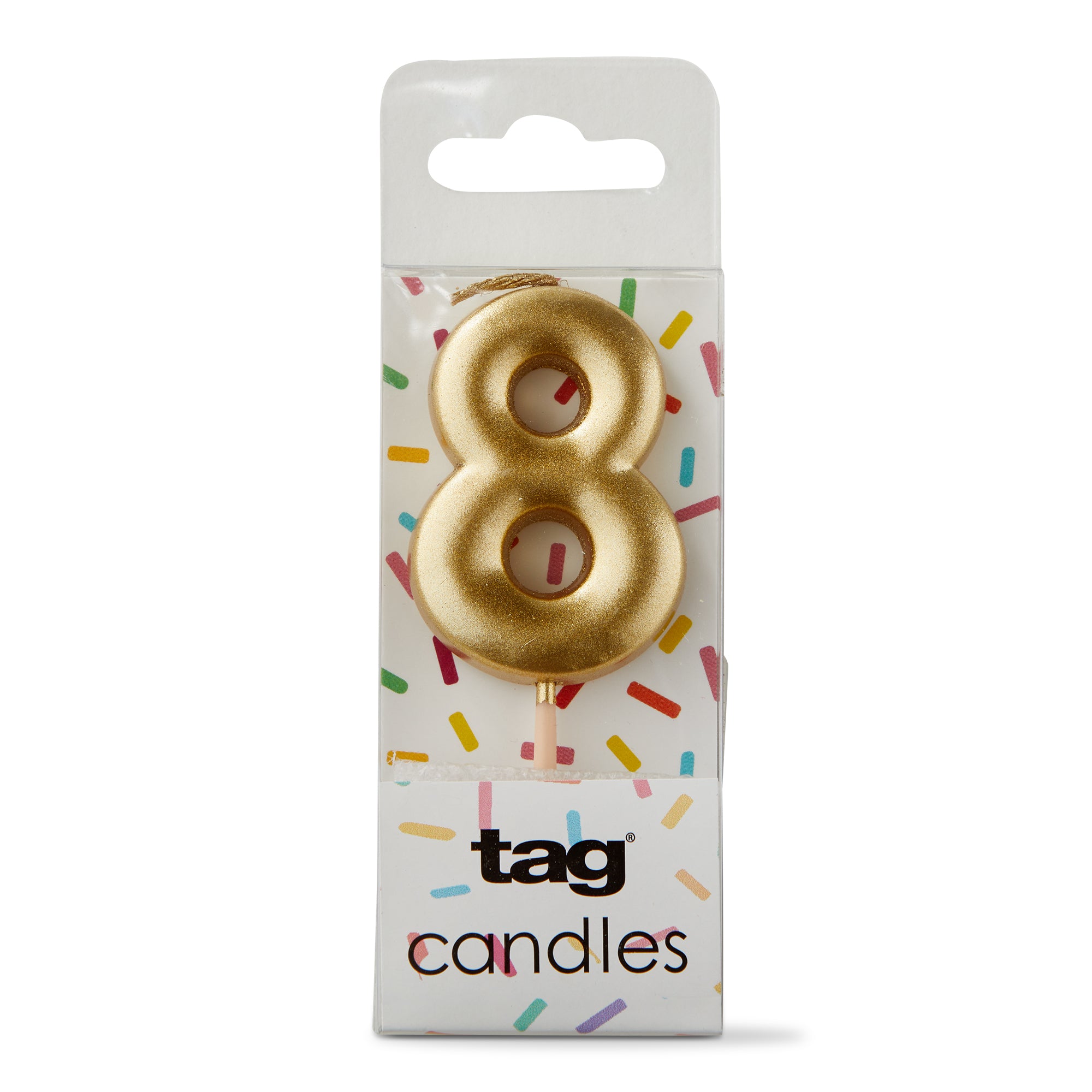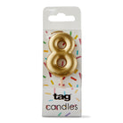Metallic Digit 8 Candle in gold with cotton wick and plastic pick stand. Mix and match with other numbers to create any milestone. View all items in Celebration.