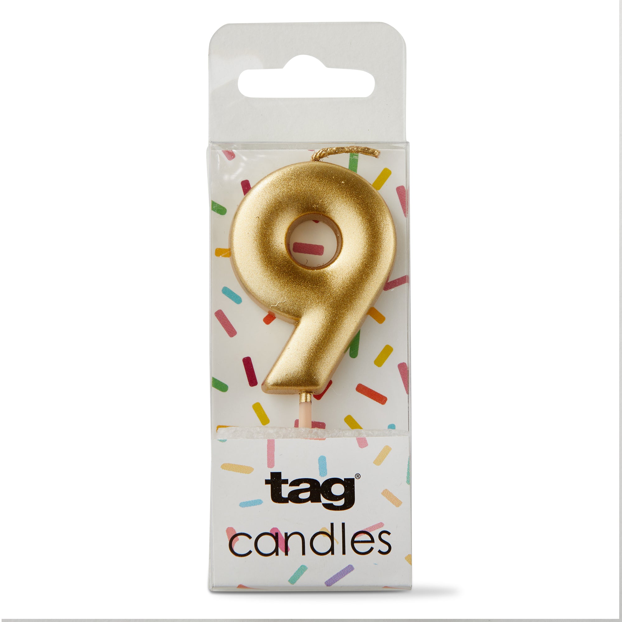 Metallic Digit 9 Candle in gold with cotton wick and plastic pick stand. Pair with other digits to mark ages and years on cakes and dessert boards. View all items in Celebration.
