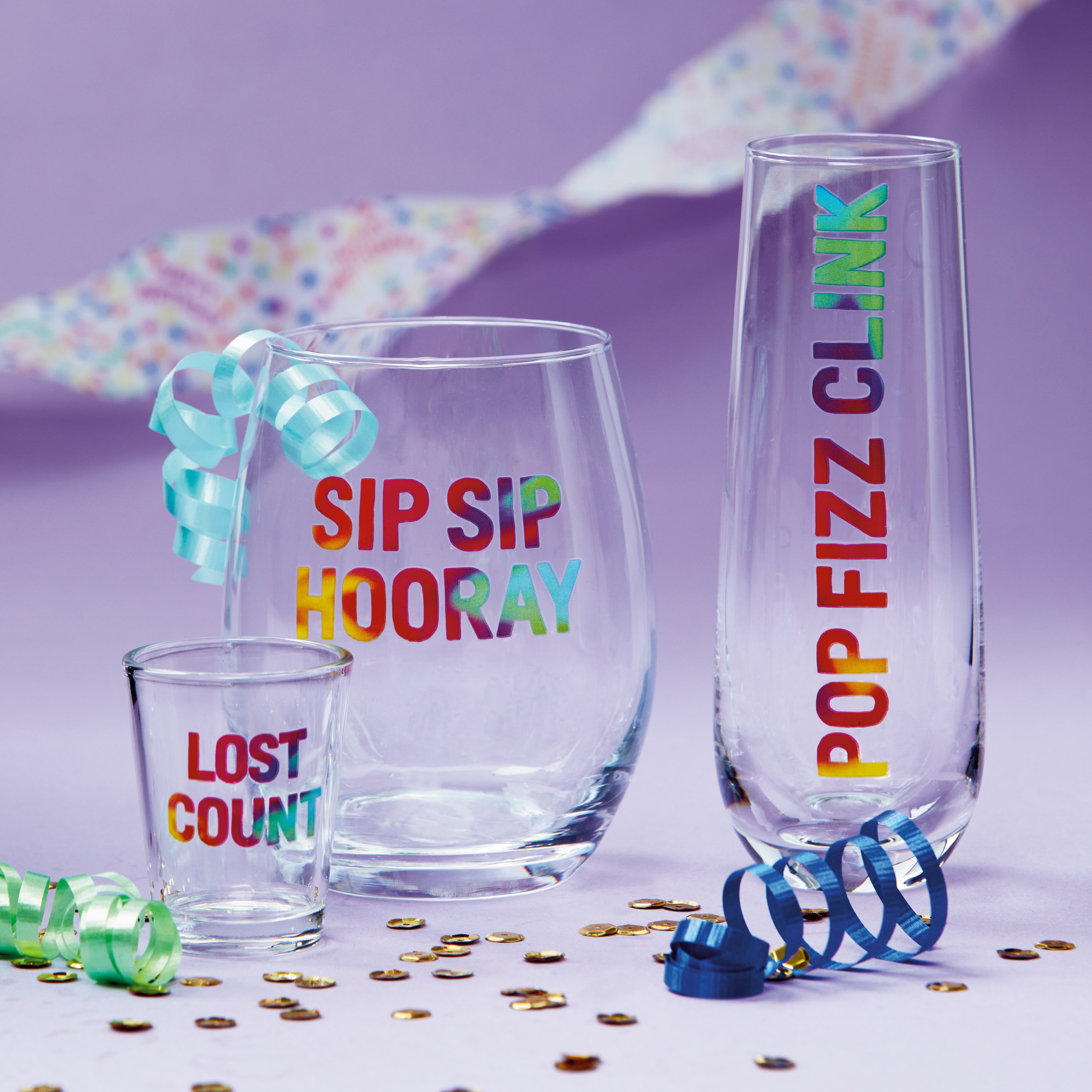 Toast to good times with this champagne glass featuring the celebratory text "POP FIZZ CLINK" in multiple colors. Top rack dishwasher safe. View all items in Celebration.