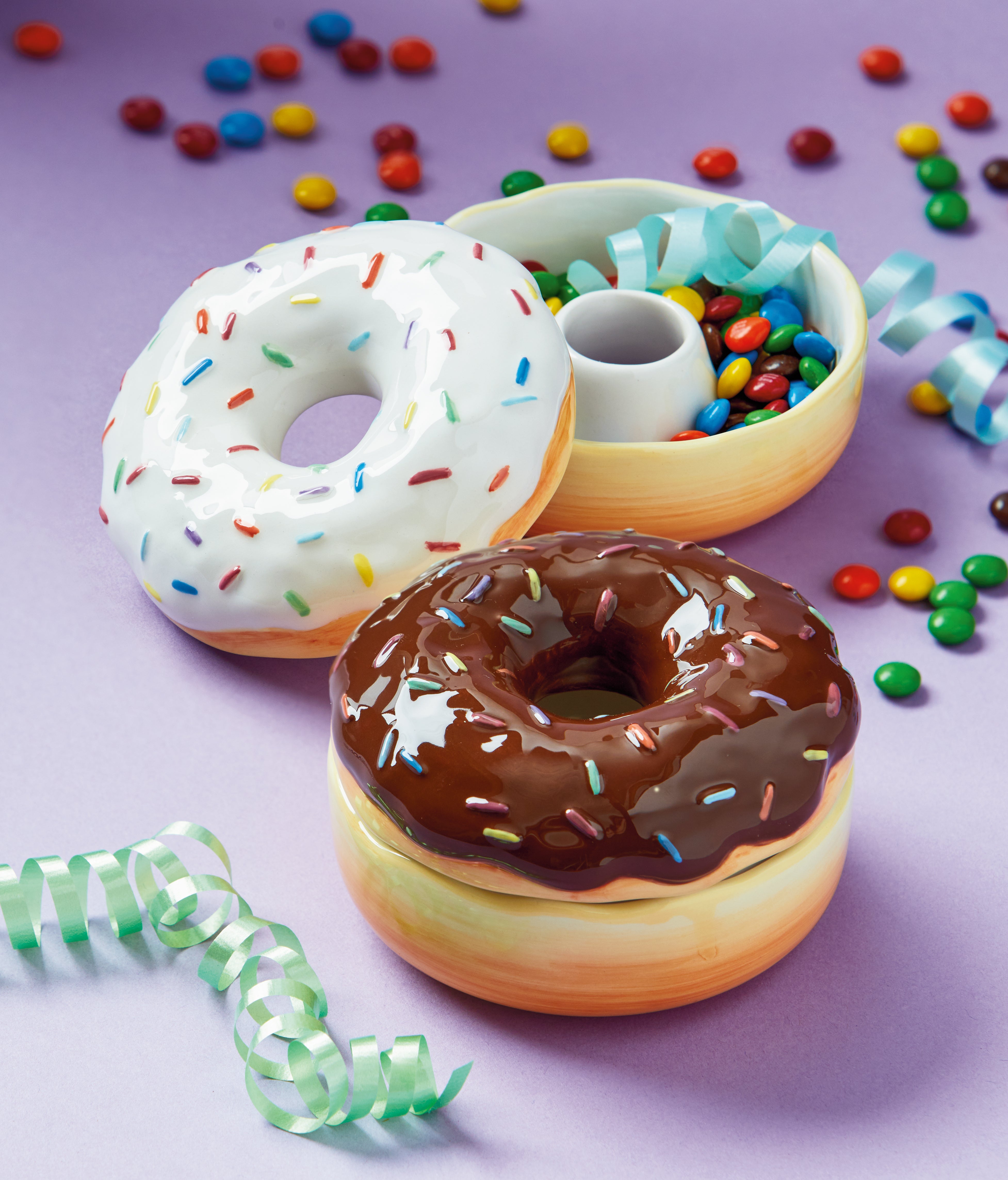 Great for Celebrations! This hand-painted earthenware trinket dish is sculpted to look like a mouth-watering chocolate donut with colorful sprinkles! View all items in Celebration.