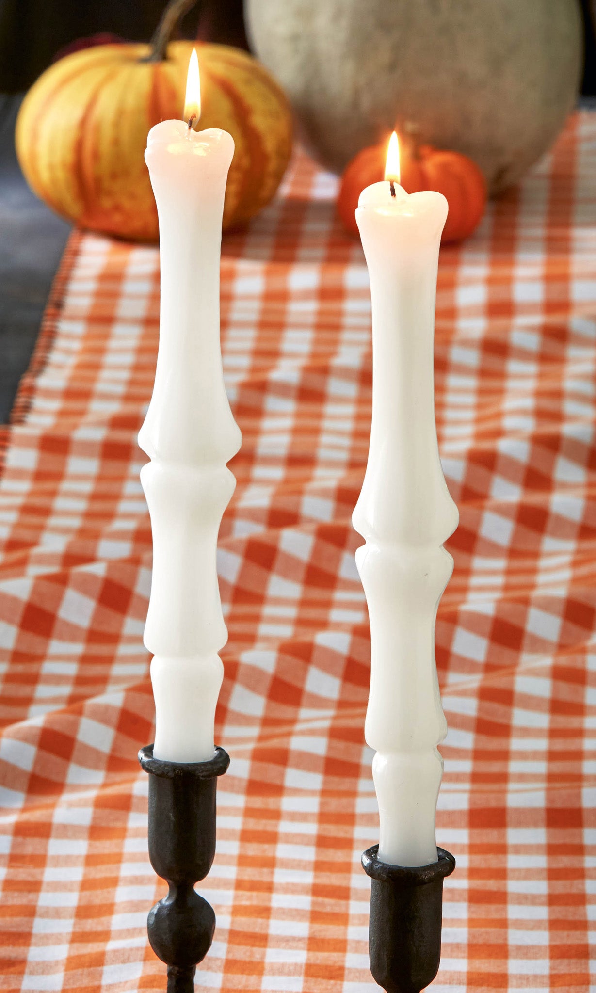 Having a skele-ton of fun! made to resemble skeleton bones, these hand-poured wax taper candles are perfect for the spooky season and halloween tablescapes. use in standard sized taper holders.