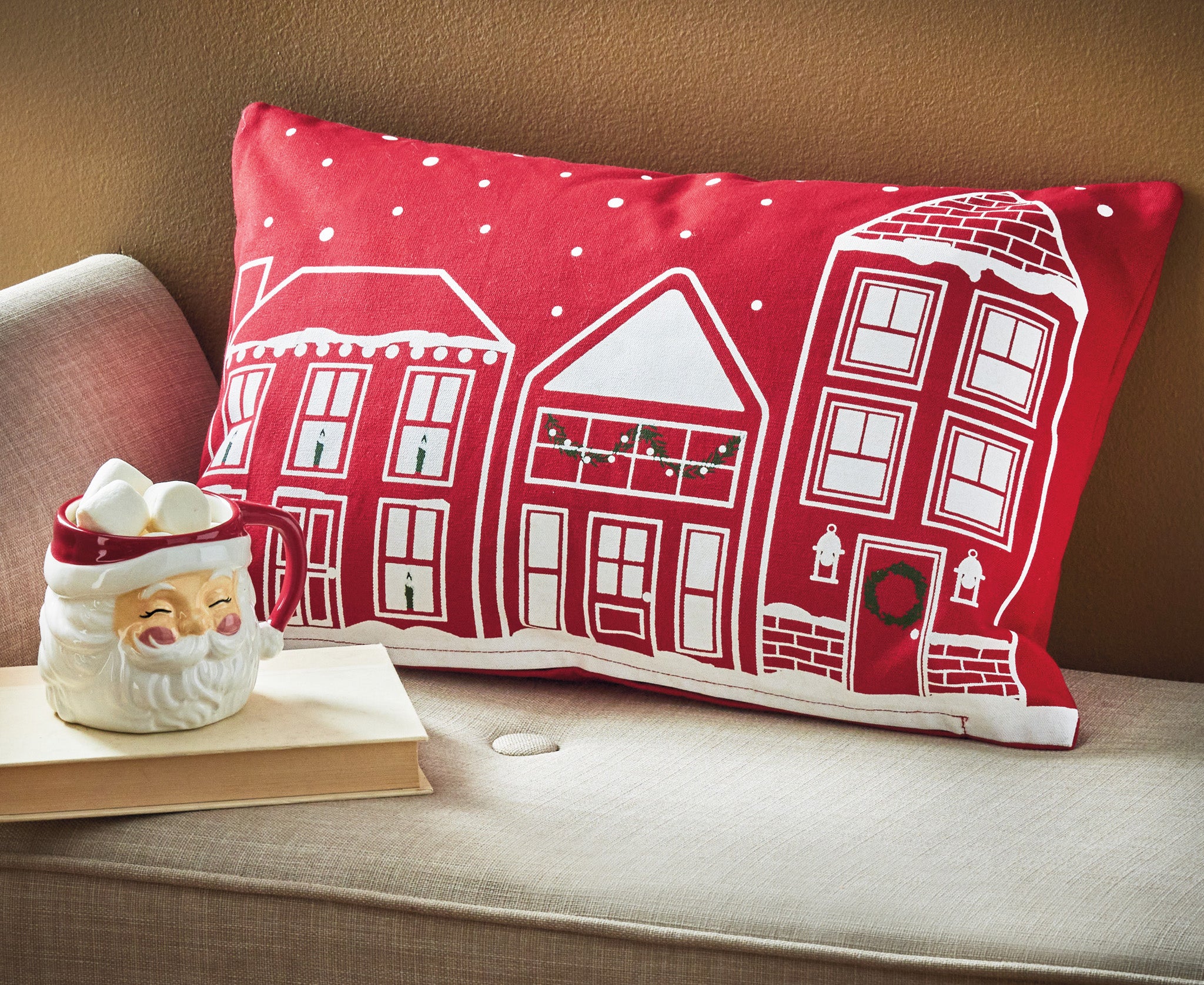 Christmas house lumbar pillow shows a row of cozy homes for storybook holiday seating and offers comfortable support on sofas or benches. Hand painted details add warmth while its versatile design makes styling simple. Sized for layered displays and pairs beautifully with seasonal greenery and décor.