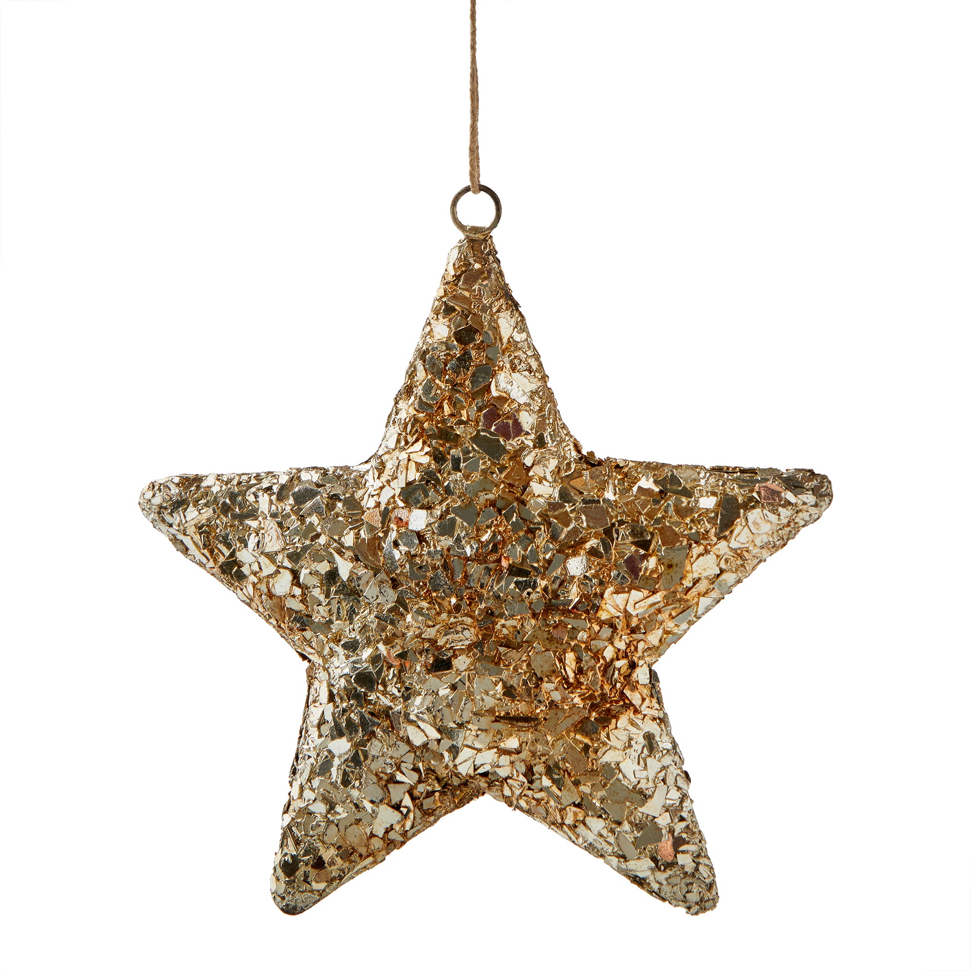 Glitter star ornament in warm gold with dimensional points. Adds sparkle and texture to branches and mixes easily with both metallic and colorful ornaments. Hand painted details add warmth while its versatile design makes styling simple. Sized for layered displays and pairs beautifully with seasonal greenery and décor.